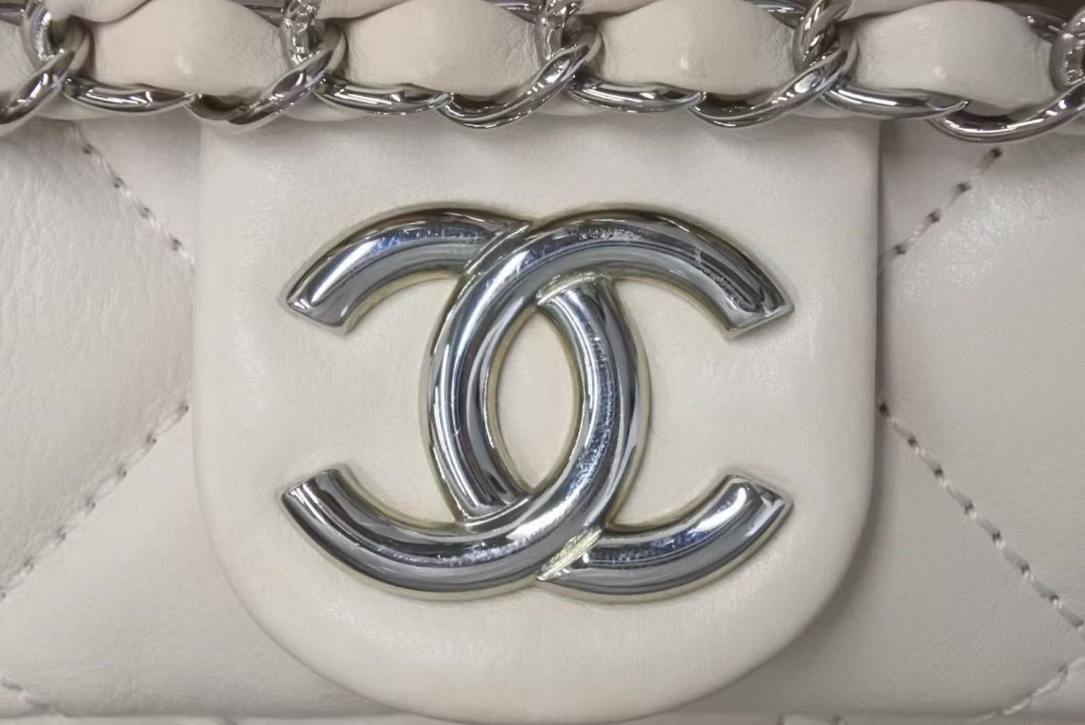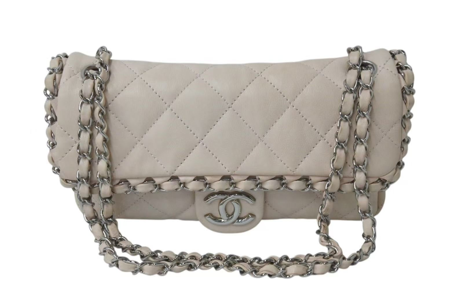 通常シャネルのバッグですとショルダー部分がチェーンの物はよくありますが、ラグジュアリーラインは生地にまでチェーンが組み込み込まれており、可愛らしさの中にハードさが感じられるデザインとなっております。