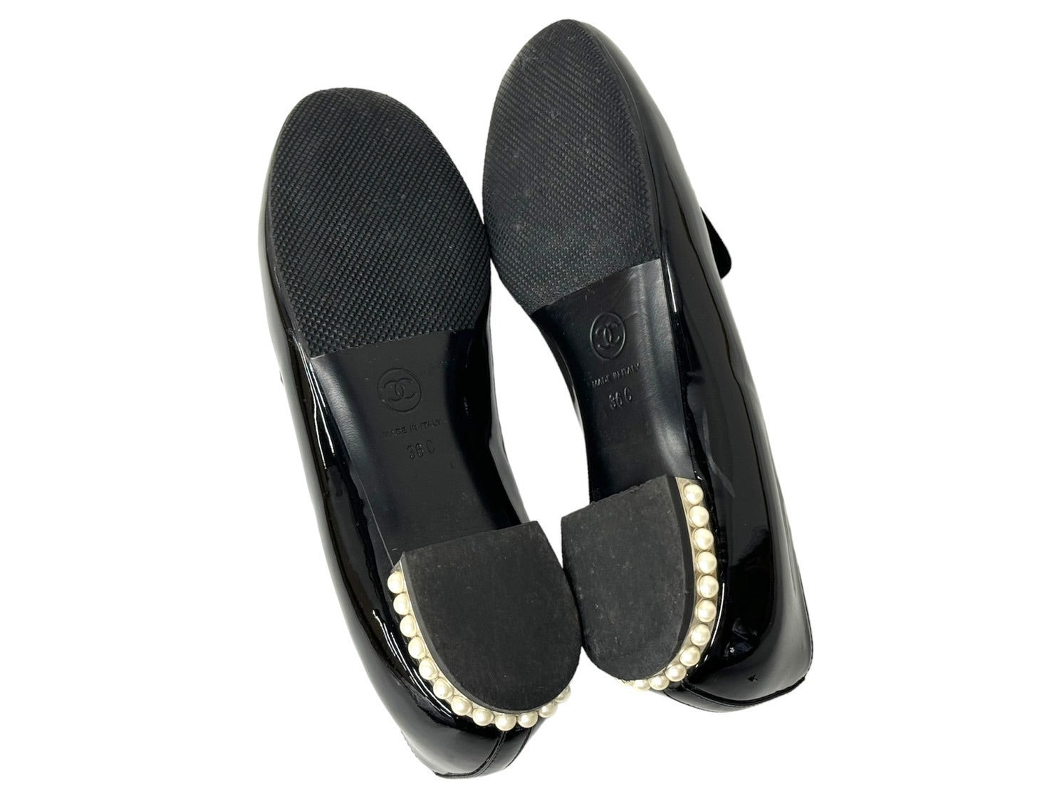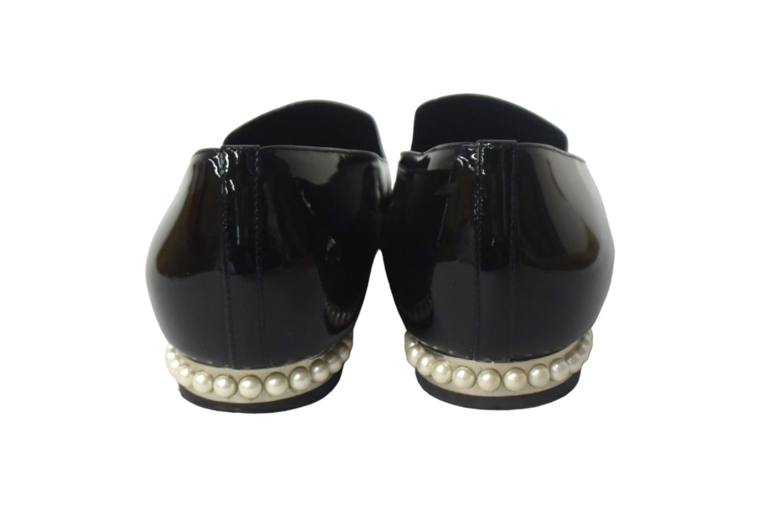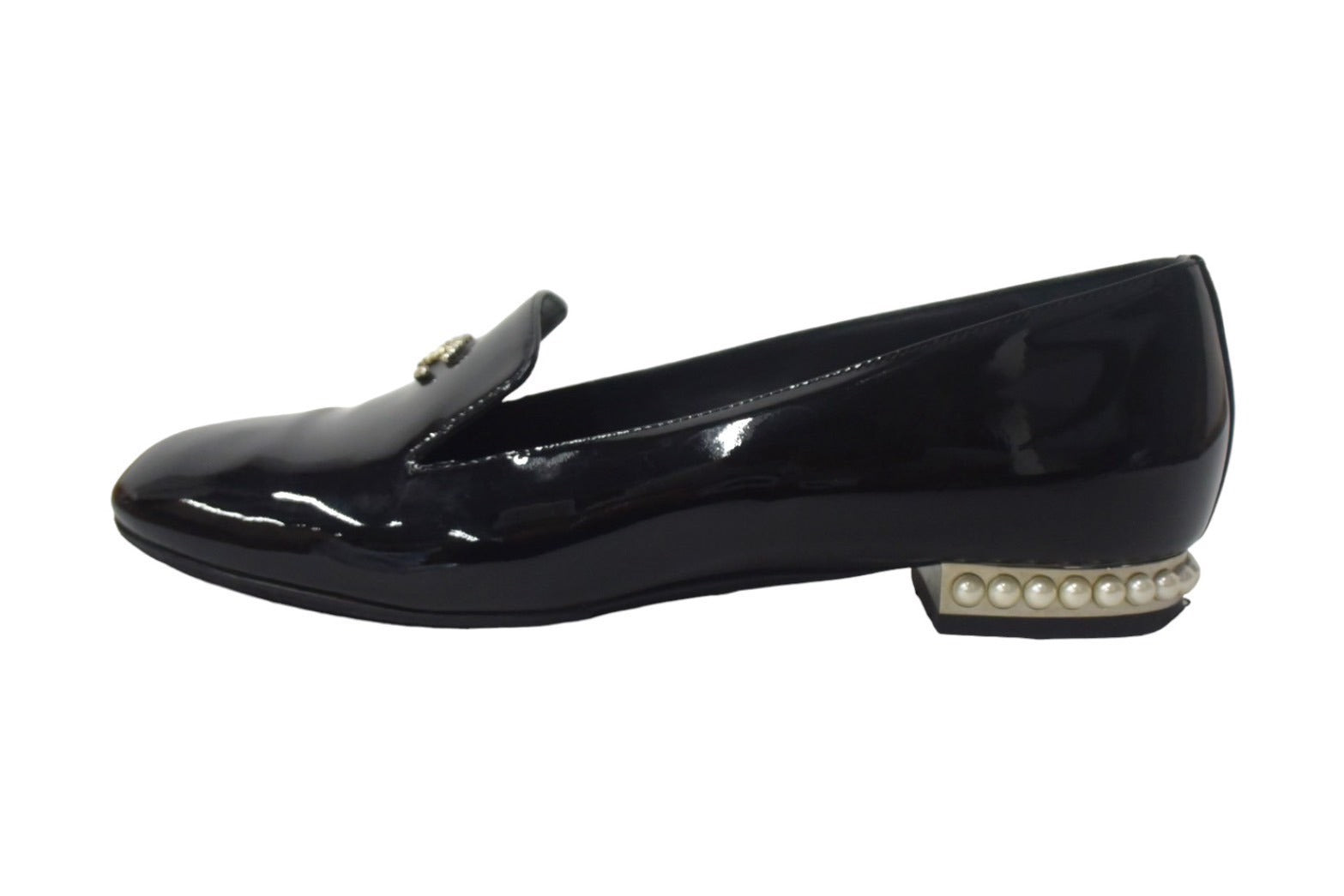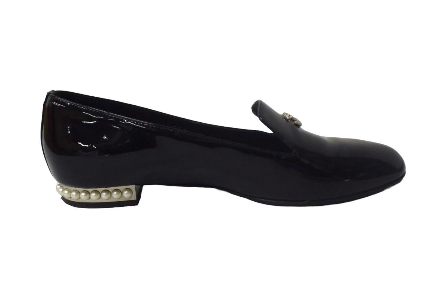 ワンポイントのココマークとフェイクパールで彩られたパテント素材のオペラシューズです。