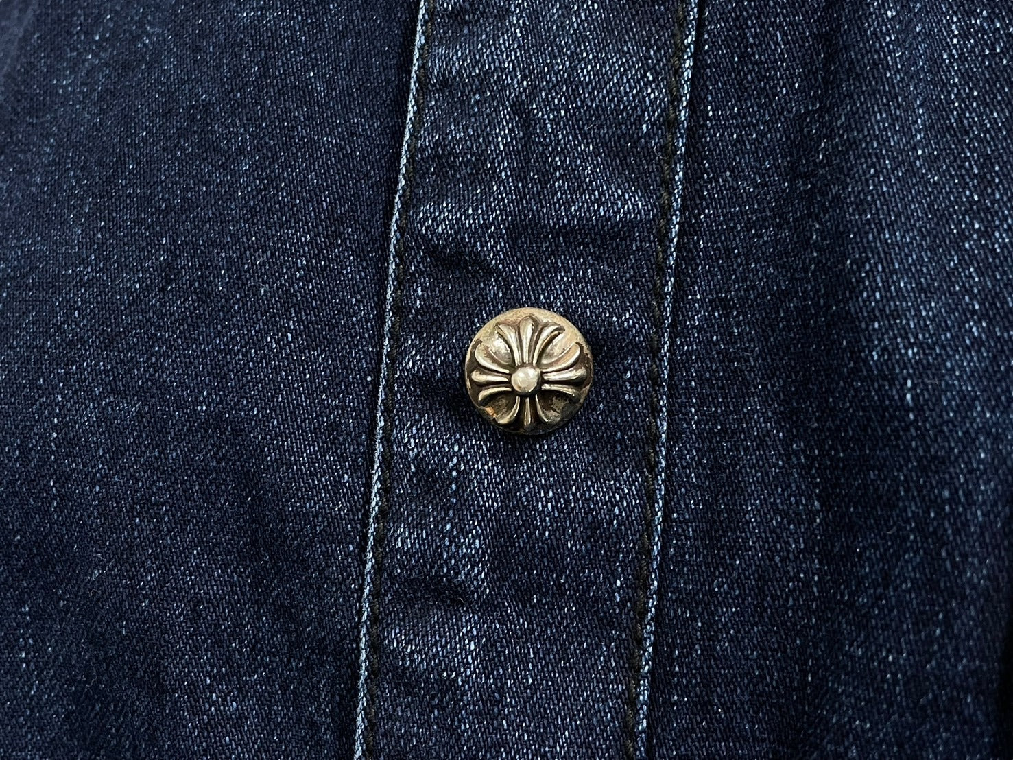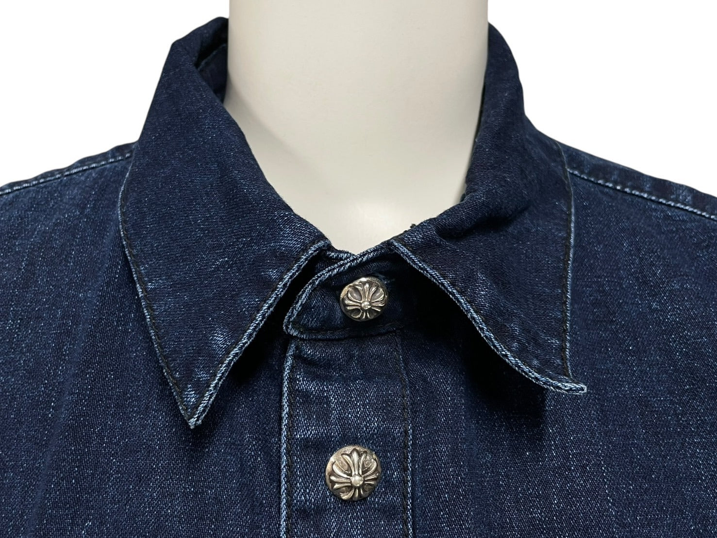 未使用 CHROME HEARTS クロムハーツ デニム長袖シャツ LOOSE ENDS ブルー デニム クロスパッチ シルバー金具 サイズM 中古 4c069728