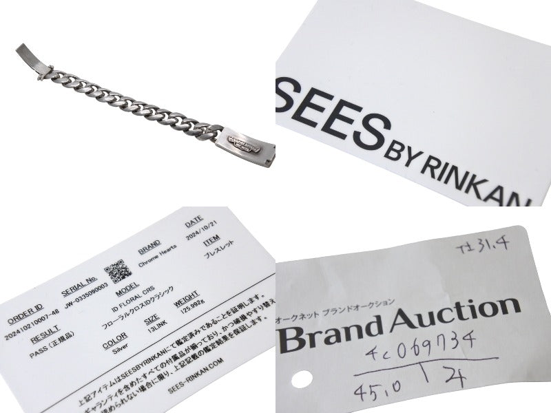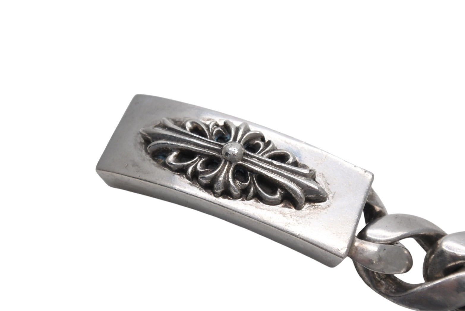 重厚感のある銀のプレートを、華やかなフレアの曲線で優美に飾ったフローラルクロスIDブレスレットクラシックチェーン。