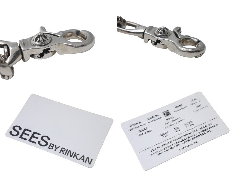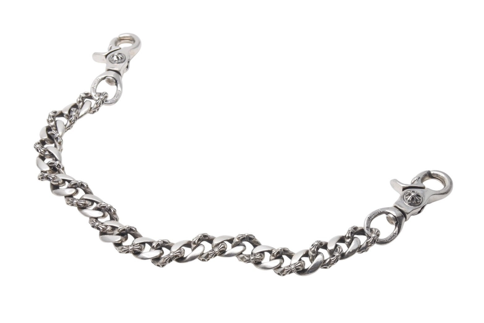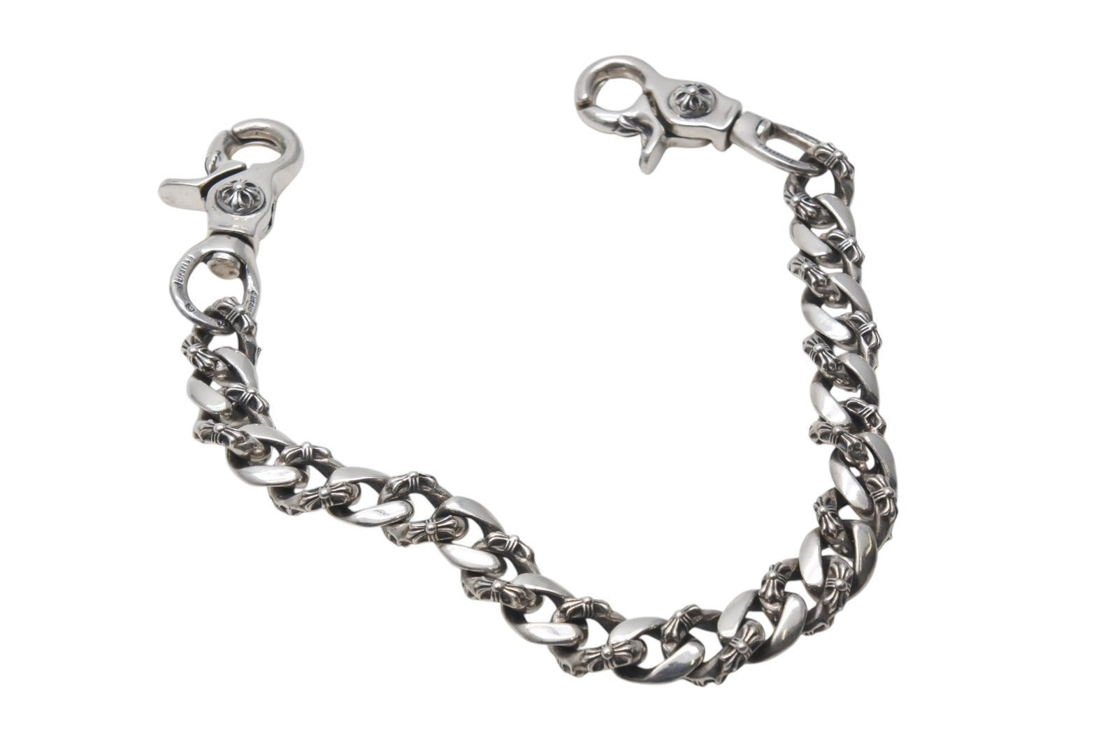 プレーンなチェーンと、細やかな技工が光る小さなクロスが模られたチェーンとが交互に交差するファンシーチェーンを採用した比較的レアで、ラグジュアリー感の強いウォレットチェーンです。