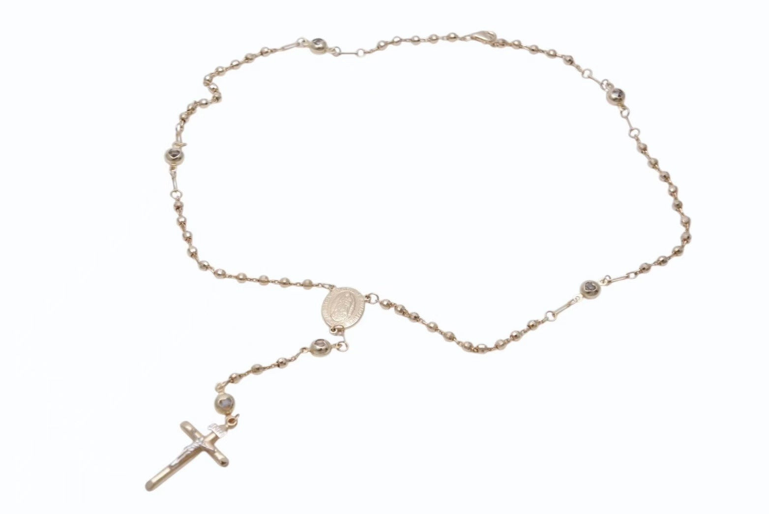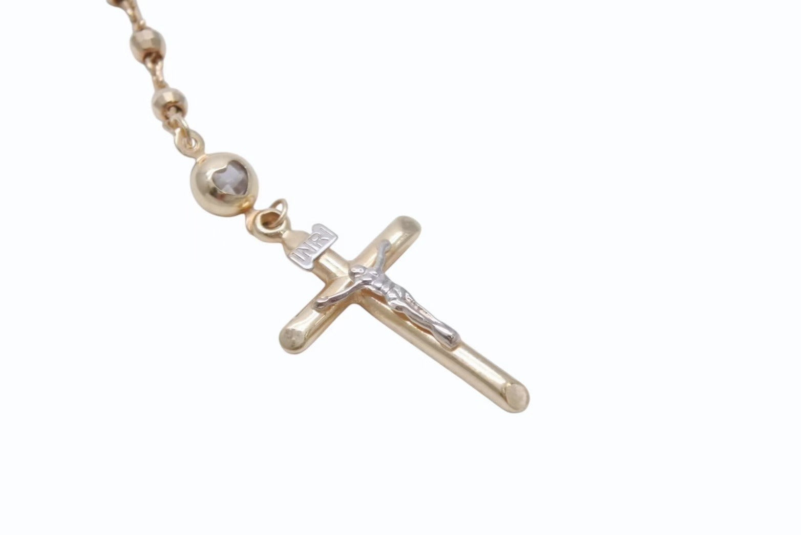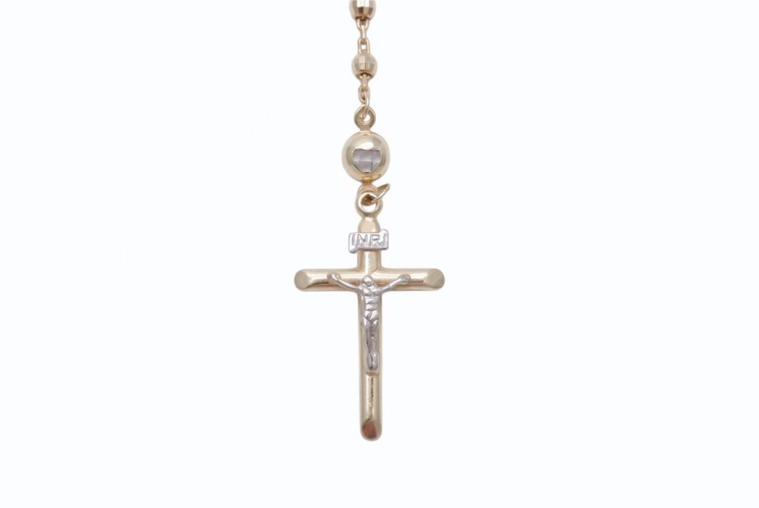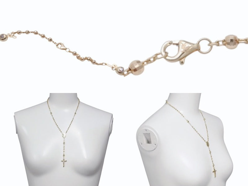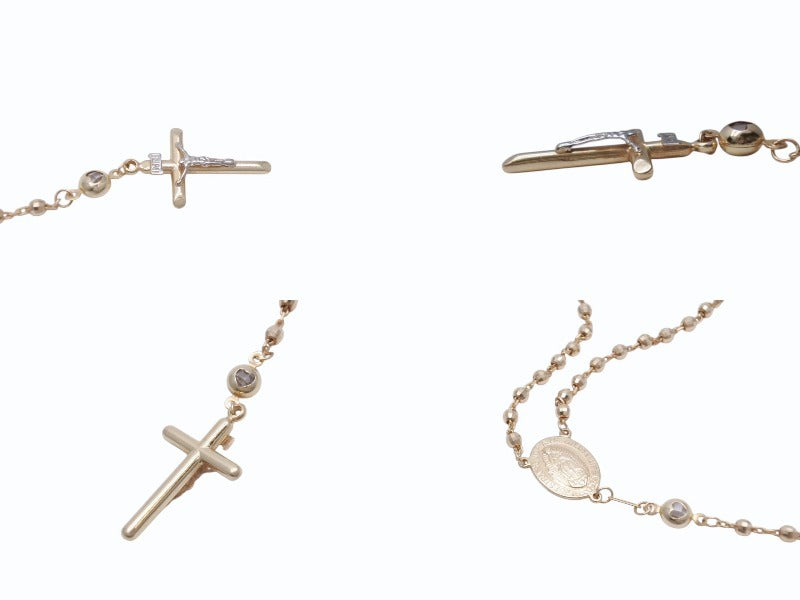 ミラーボールチェーンならではの輝きや、コンビで表現された磔刑されているキリストなど、デザイン性の高いロザリオです。14K素材で品と高級感のあるアイテムです。