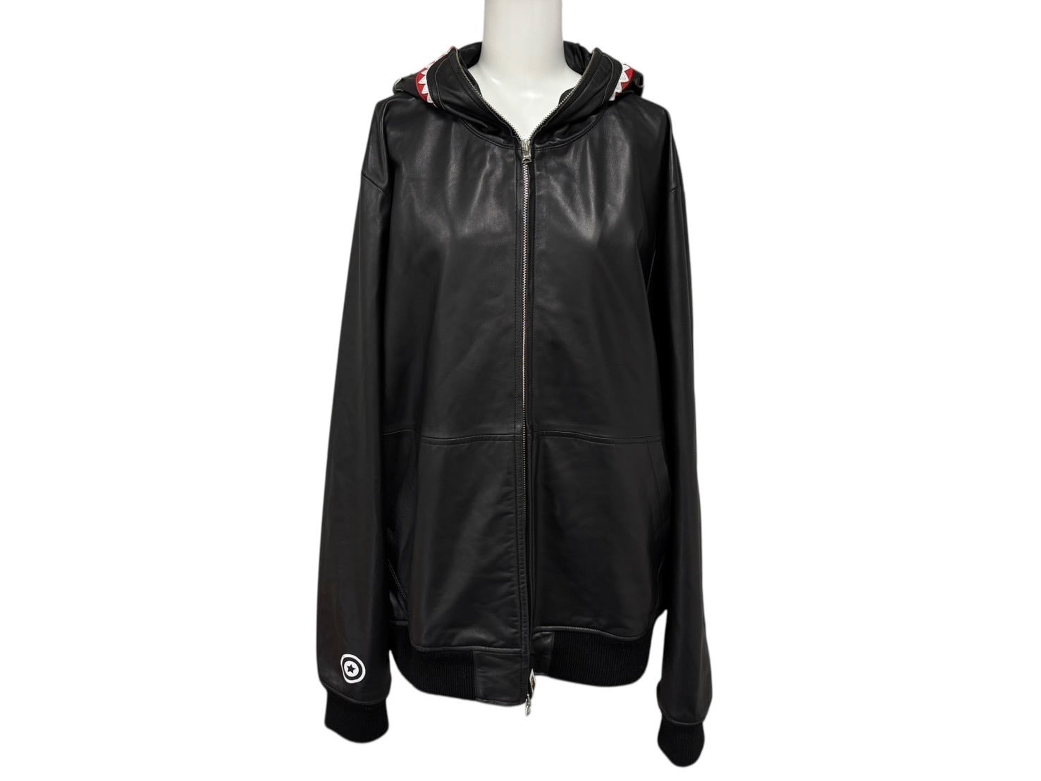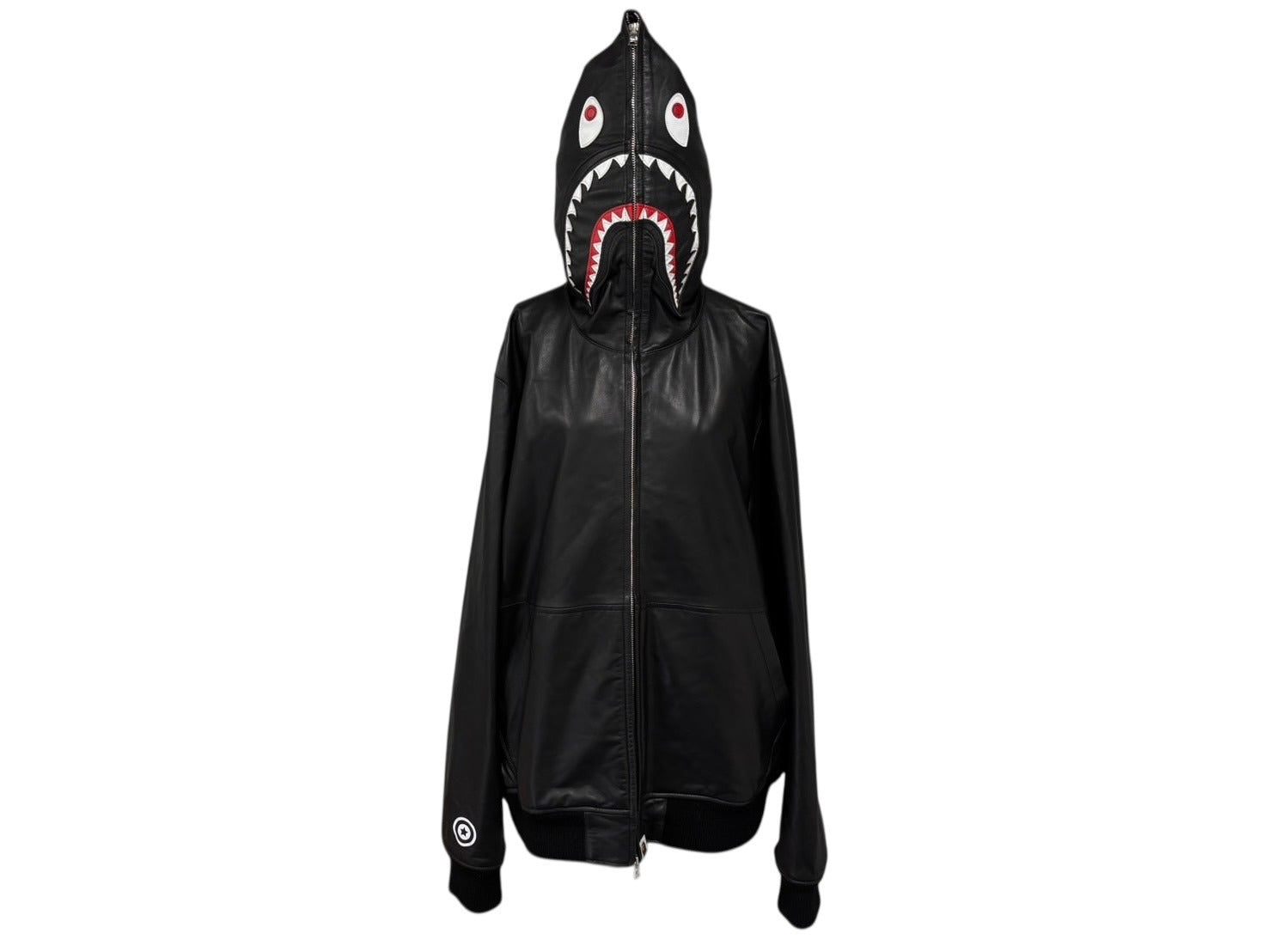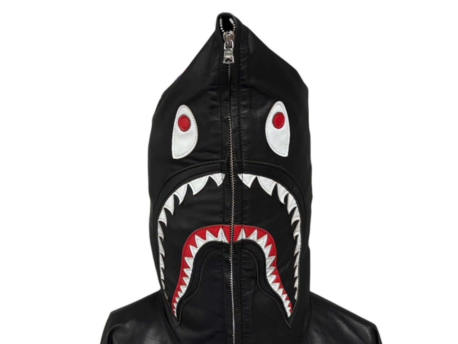 フード部分に大胆にあしらわれたサメのグラフィックが特徴で、フルジップ仕様により顔全体を覆うことも可能な独創的なデザインが魅力的なアイテムです。