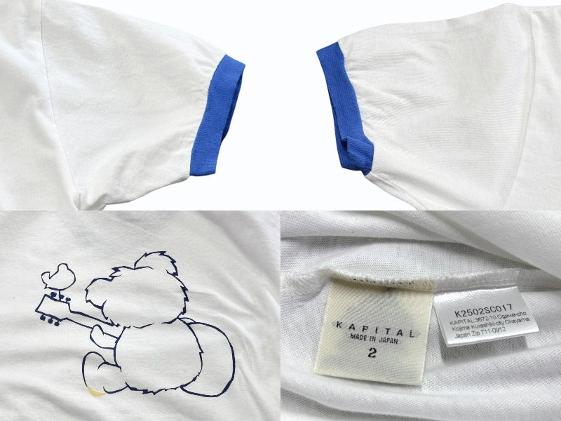 フロントにギターを弾く、ソックスを履いた小熊をプリントしたVネックリンガーT。