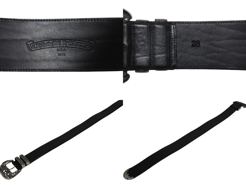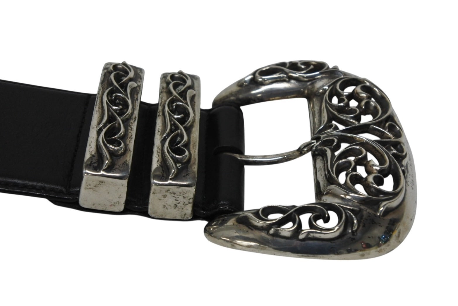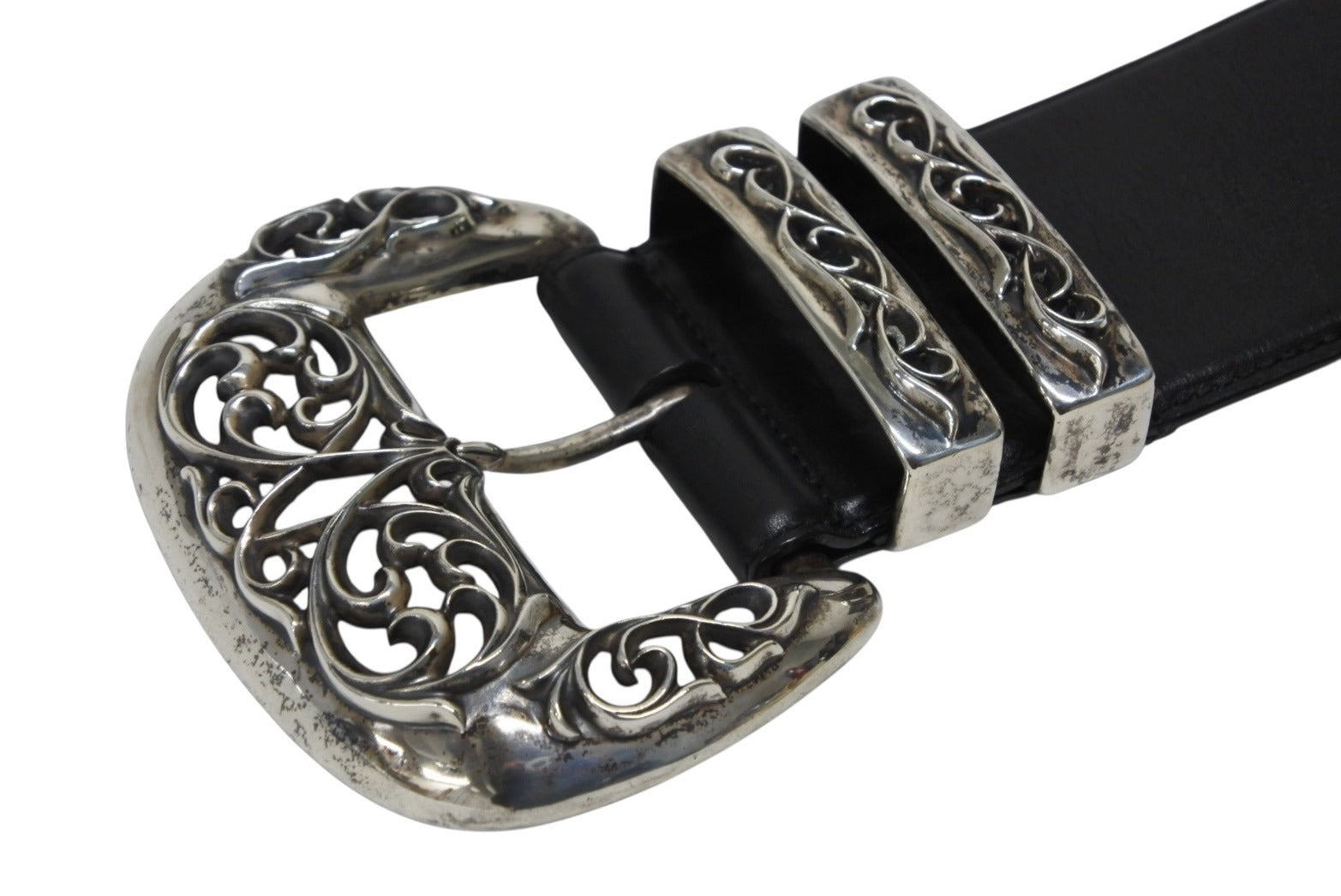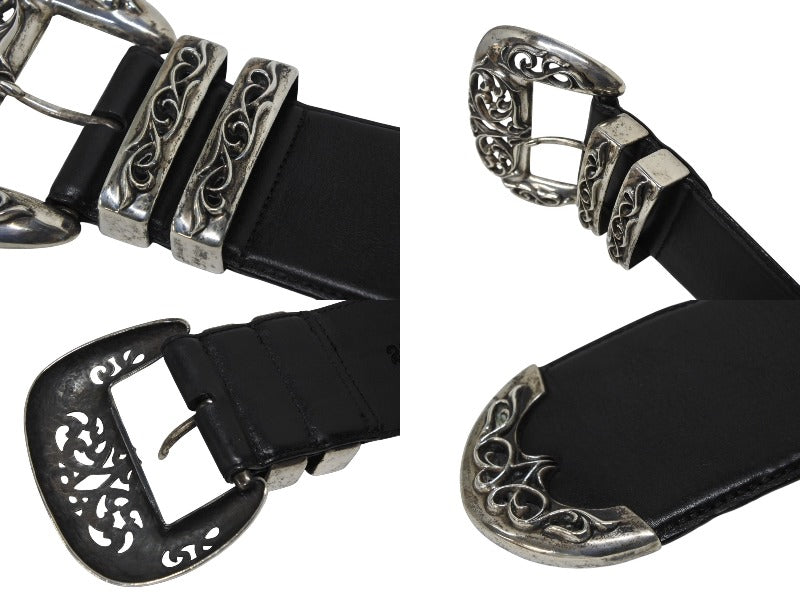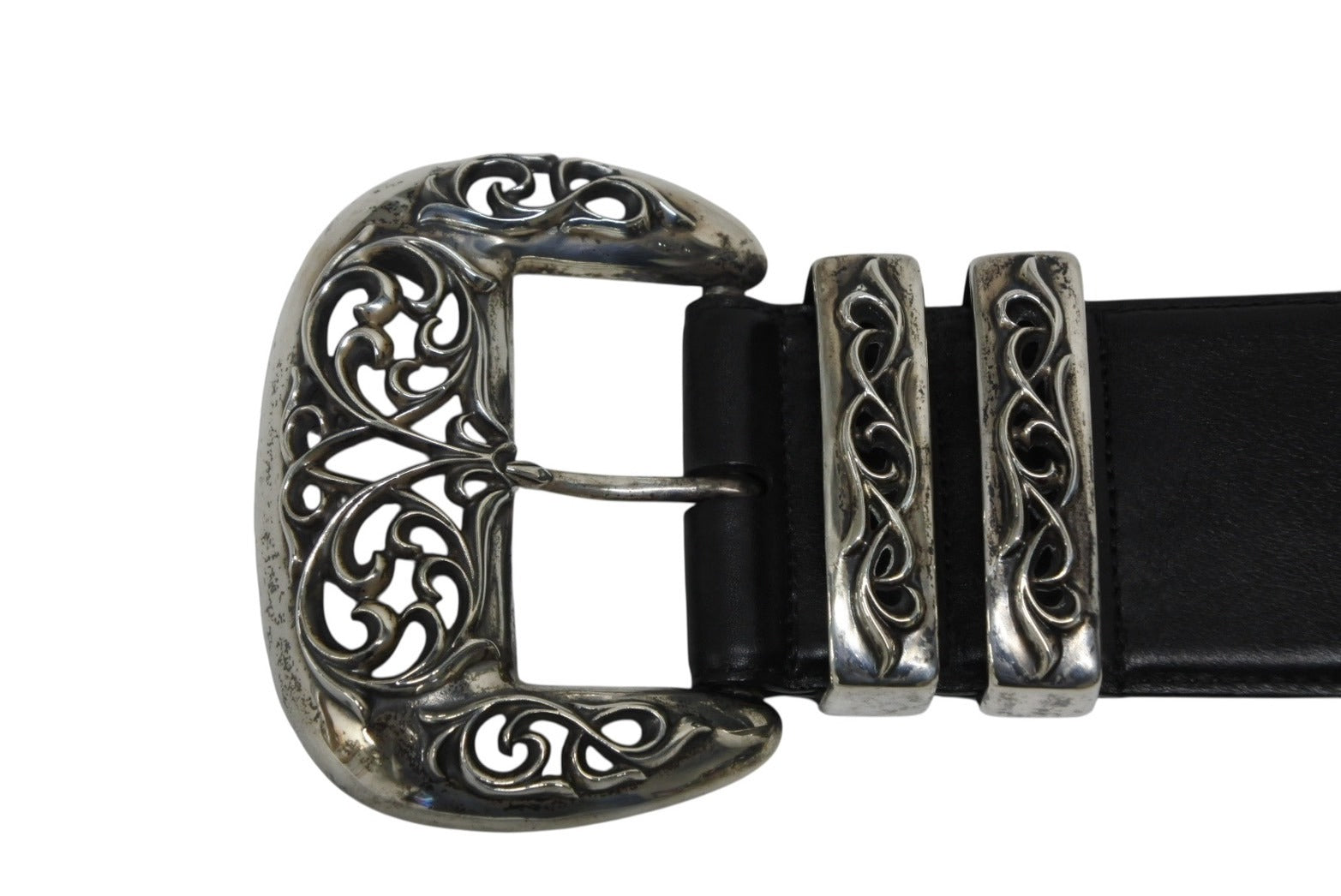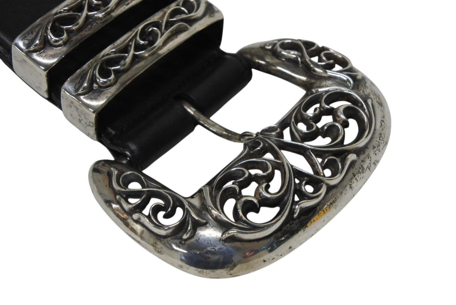 大ぶりなバックルが強烈な存在感を放つ3PCレザーベルトです。
