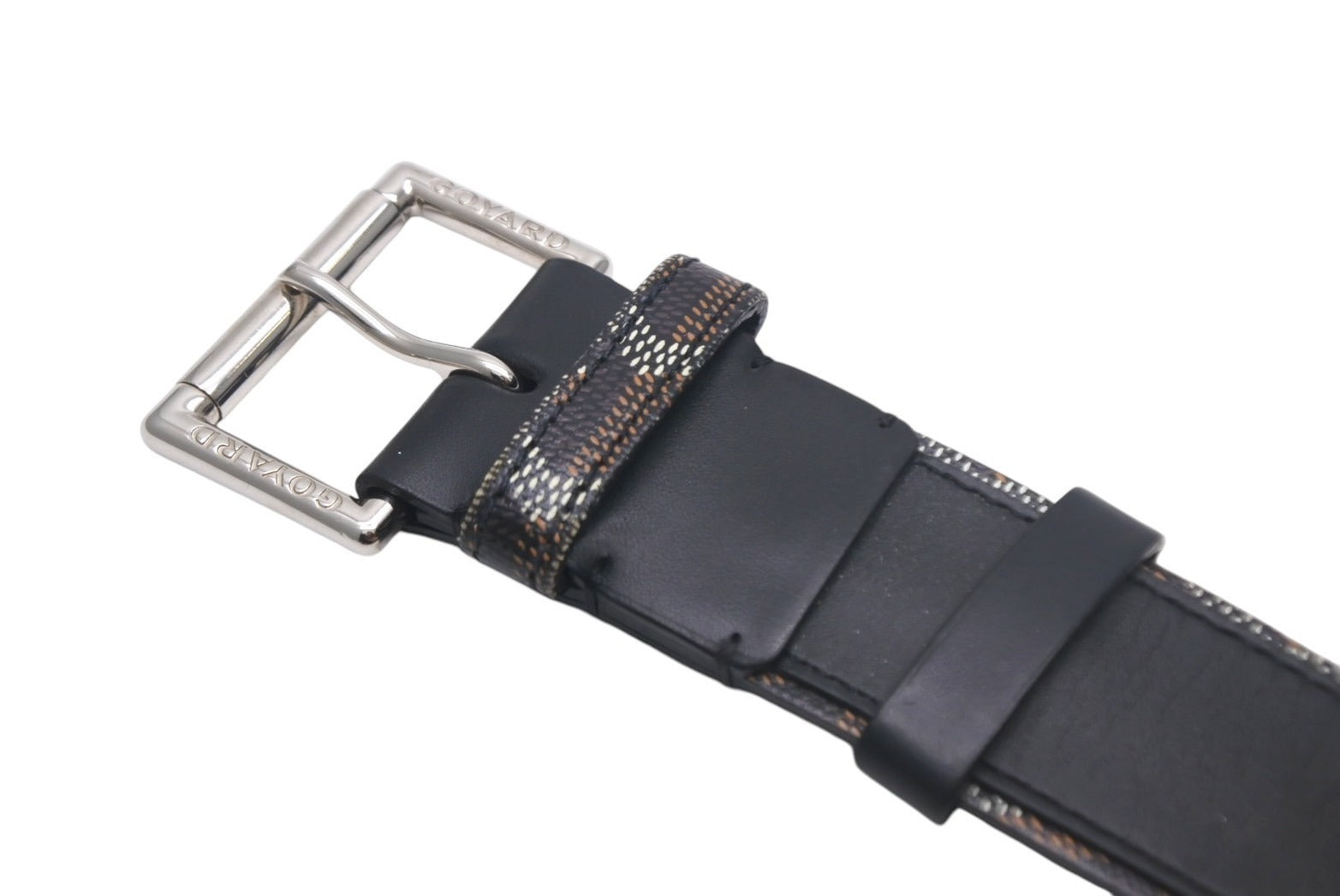 幅のサイズがカジュアルなスタイルにぴったりで、バックルにはゴヤールの刻印、裏面にゴヤールディンキャンバスが施されるなど、たくさんのディテールを楽しめます。