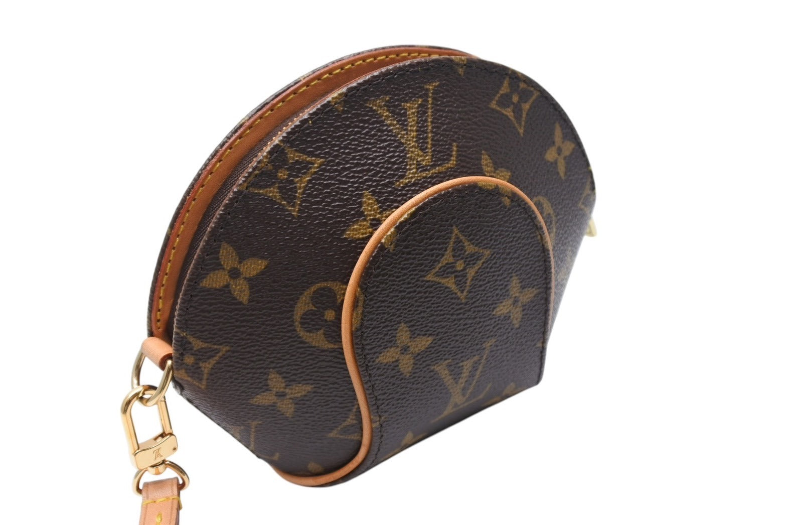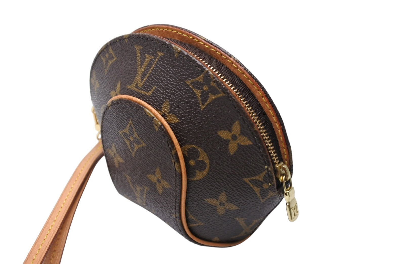 コロンとした形が個性的なポーチ。取り外し可能なヌメ革ストラップ付き。中間部が膨らんでいる分、中身も意外にたくさん入り、ミニバックとしてもコスメポーチにしてもOK。