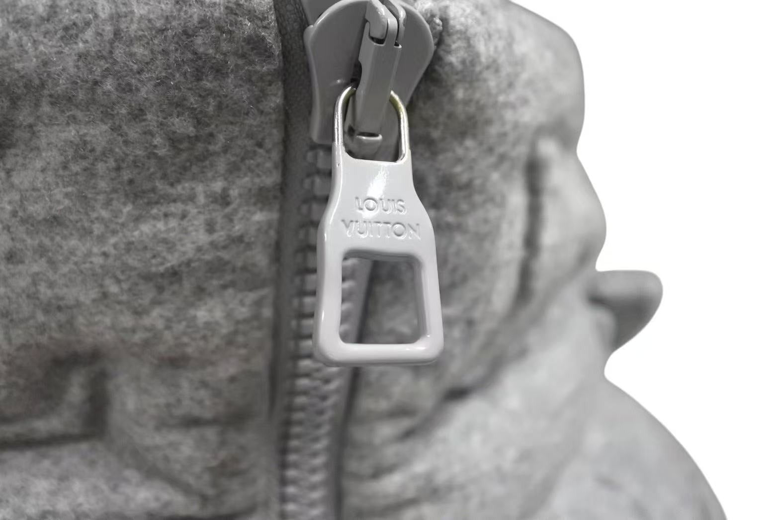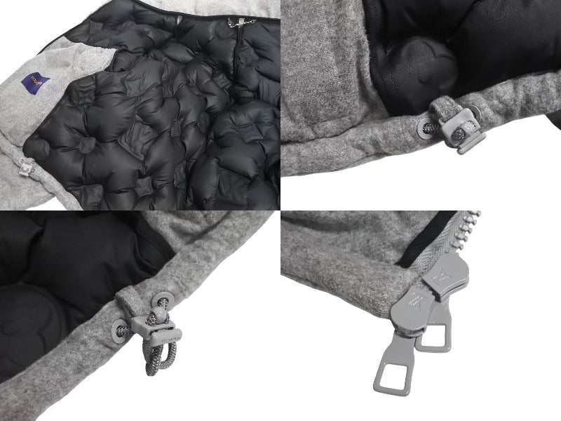 柔らかいカシミヤの混紡素材をオーバーサイズに仕立て、内側には天然のダウンを詰めました。特殊な熱処理によってエンボス加工したモノグラムを全面に散りばめ、独特な「ワッフル」風の外観を生み出しています。手首部分の機能的なドローストリングも特徴です。