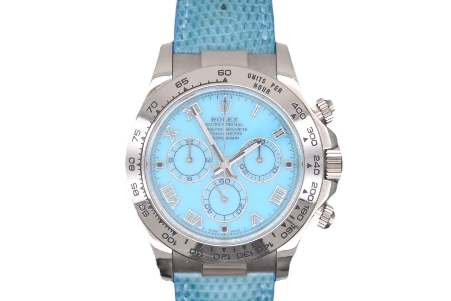 ホワイトゴールドのケースに天然石であるターコイズを文字盤に使用している、デイトナビーチです。