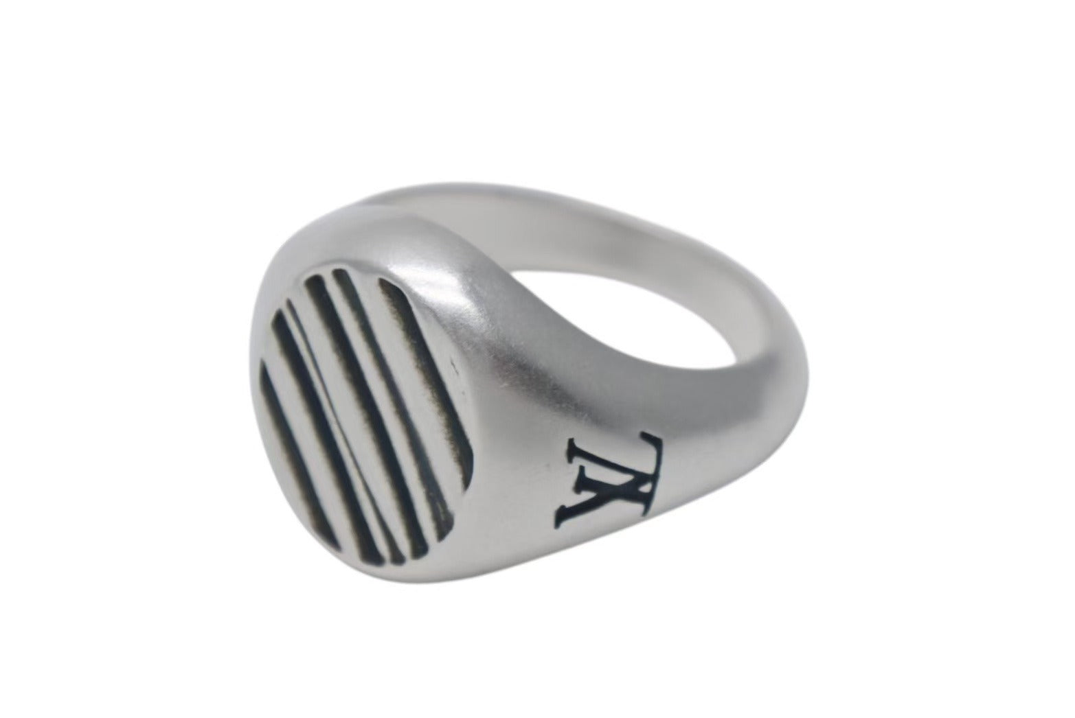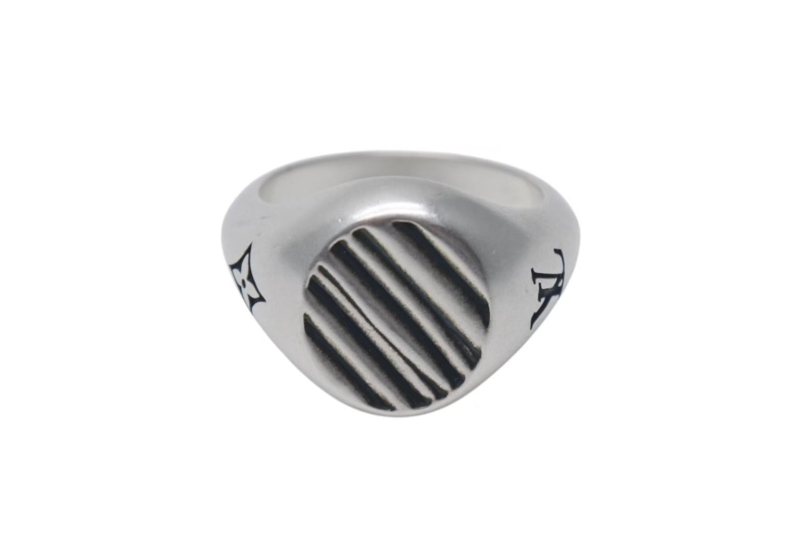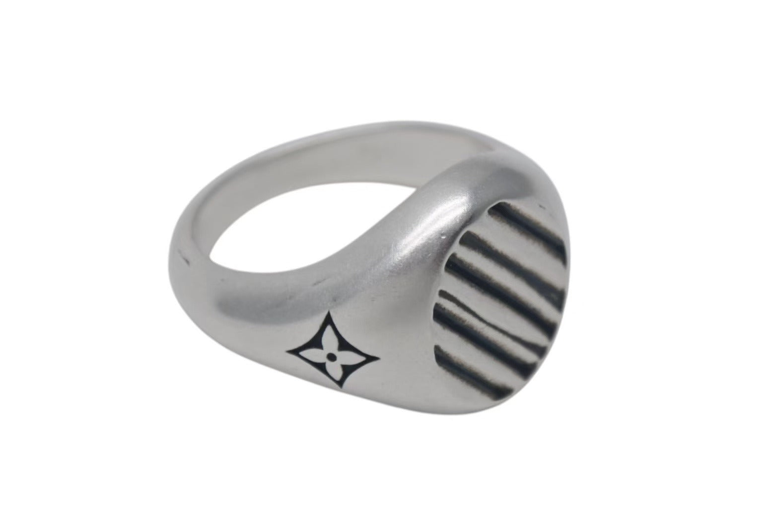 シルバーカラーで仕上げ、メゾンのシグネチャー・マテリアルであるエピ・レザーのグレインを想わせる装飾をあしらった丸いセンター部分が特徴の「リング・LV エピ」。ディテールの片側にはLV イニシャルが、もう片側にはモノグラム・フラワーがあしらわれています。3つの装飾すべてにブラックのパティーナ加工を施してアンティーク調に仕上げました。快適な着け心地と現代的な表情が魅力。