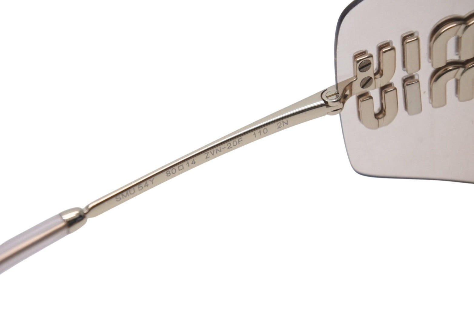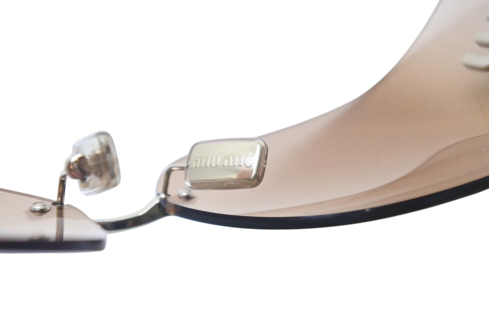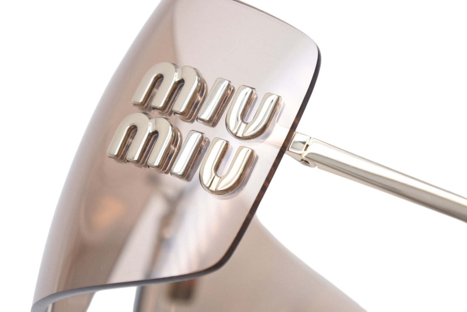 洗練されたモダンなデザインのメタルサングラス。カーブしたレンズに縦向きの印象的なMIU MIU ロゴをあしらった、超軽量なリムレススタイル。