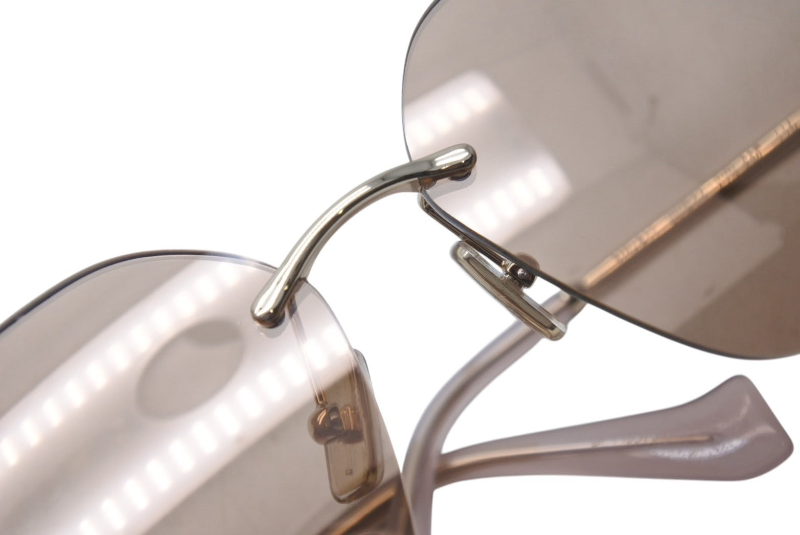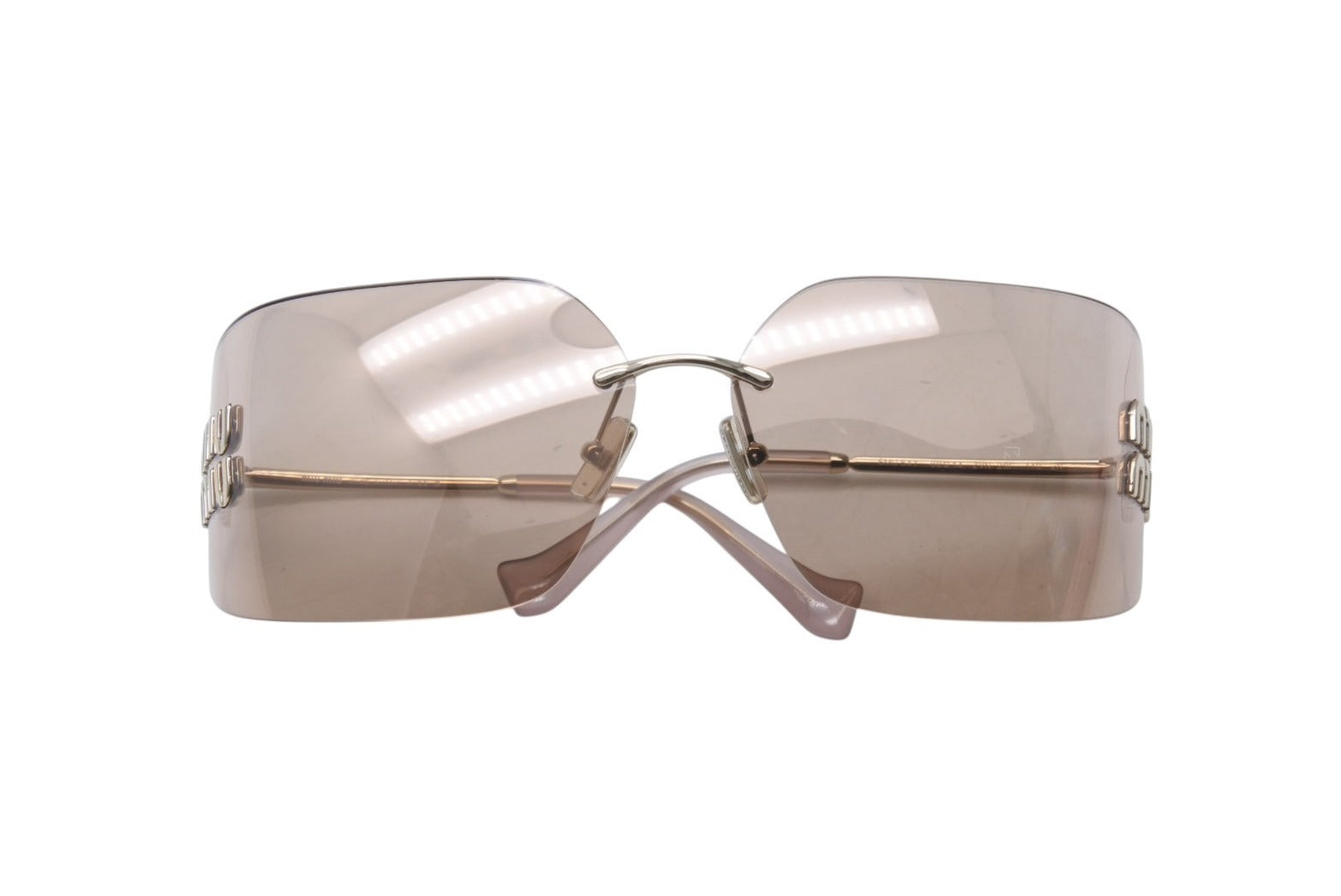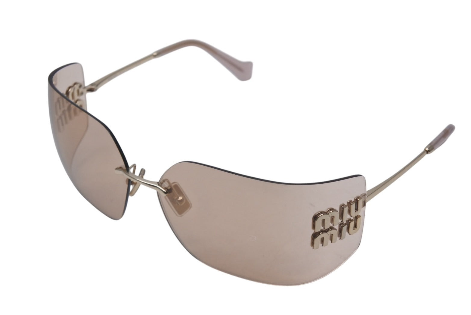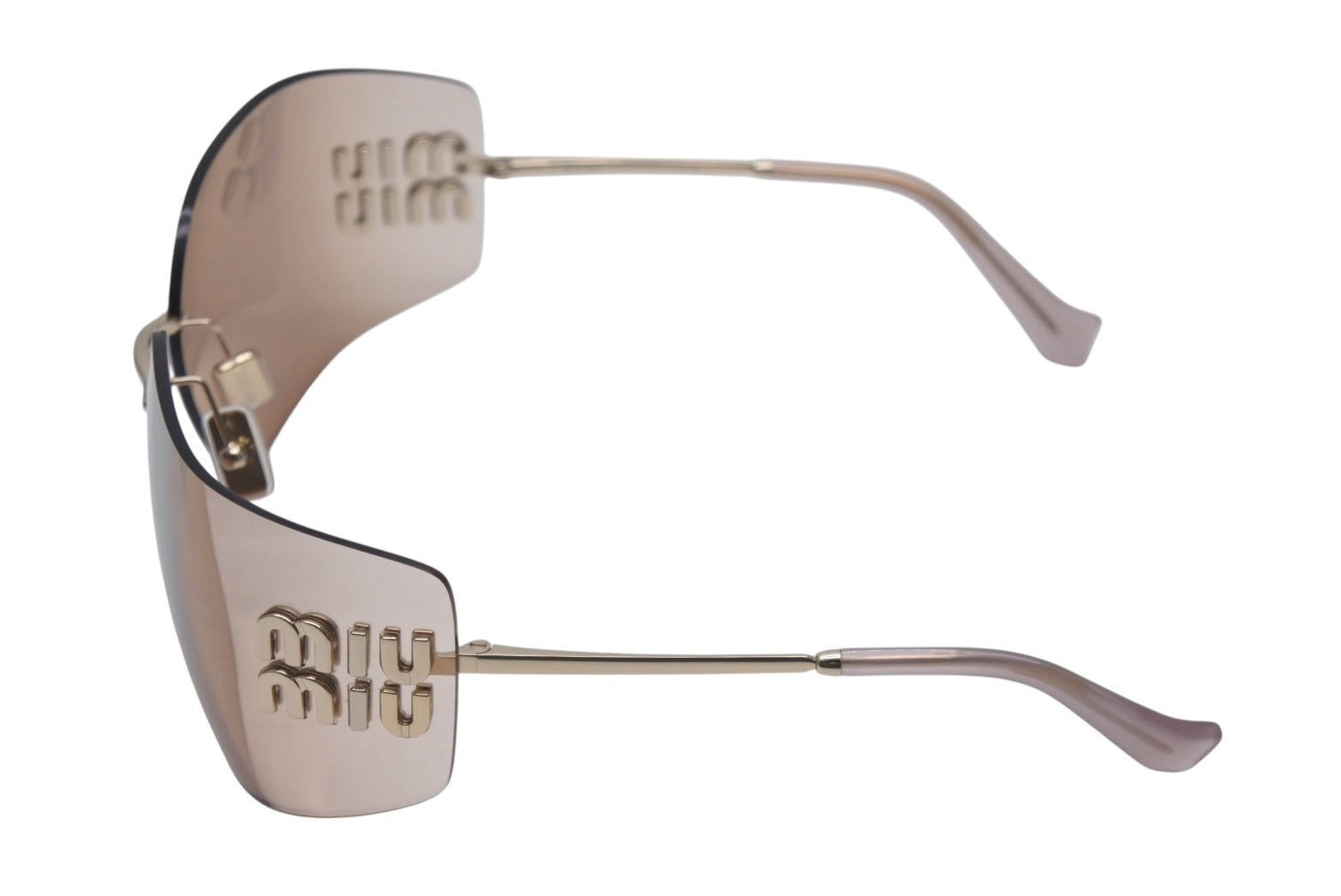 洗練されたモダンなデザインのメタルサングラス。カーブしたレンズに縦向きの印象的なMIU MIU ロゴをあしらった、超軽量なリムレススタイル。