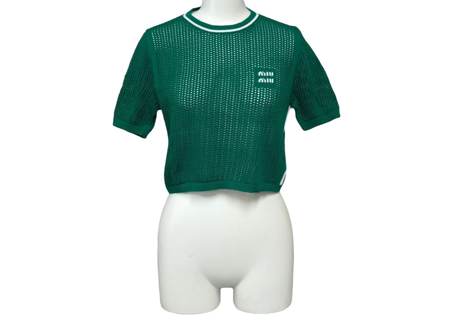 リブニットでトリミングされたクロップドシルエットが特徴です。