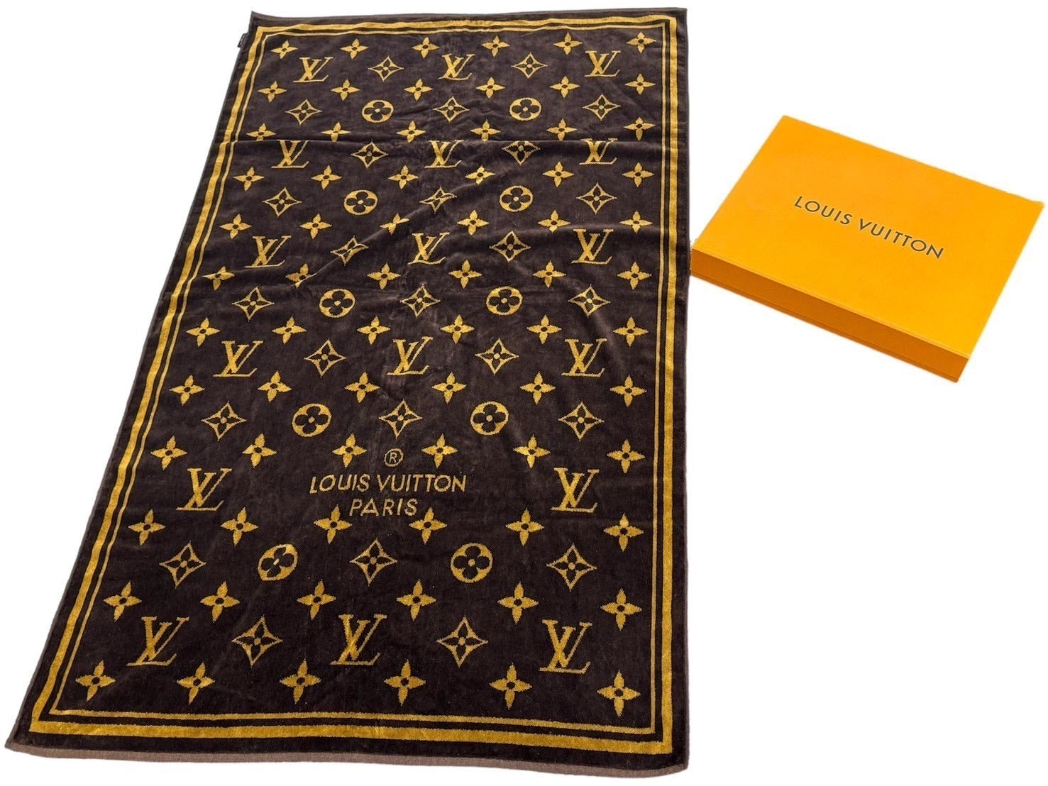 ビーチでの視線を集めるルイヴィトンの伝統的なモノグラムパターンが施されたビーチタオルです。