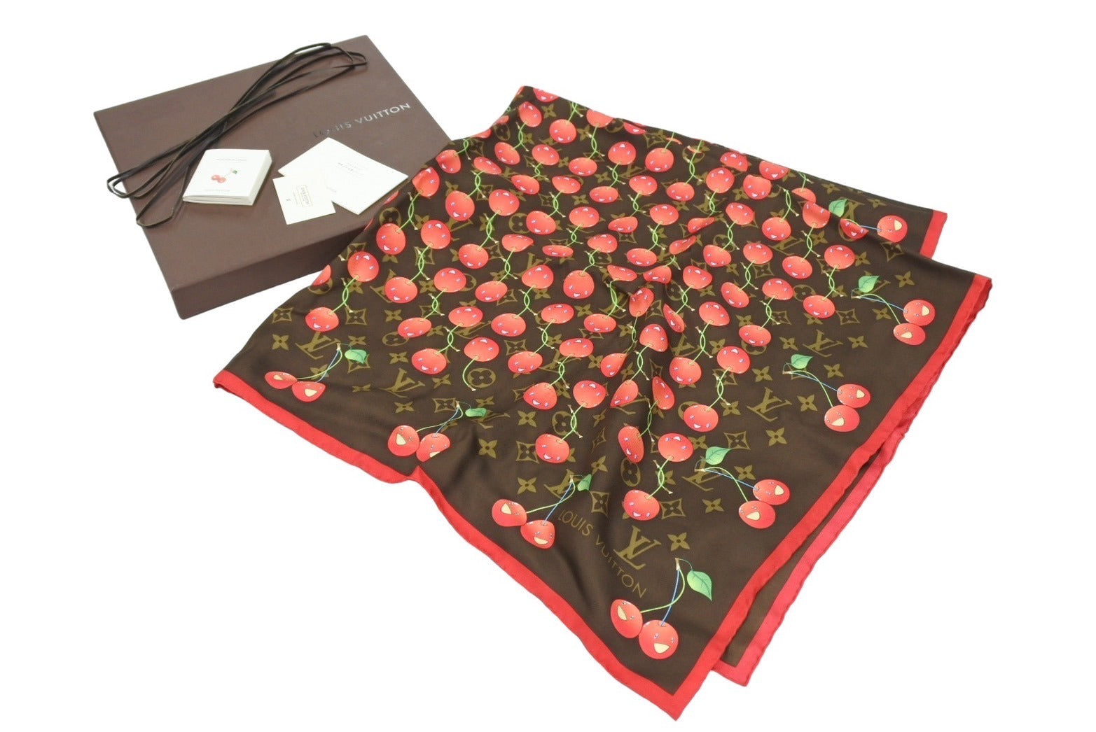 新品同様 LOUIS VUITTON ルイヴィトン スカーフ 村上 隆 モノグラムチェリー M71962 シルク ブラウン レッド 中古 66330