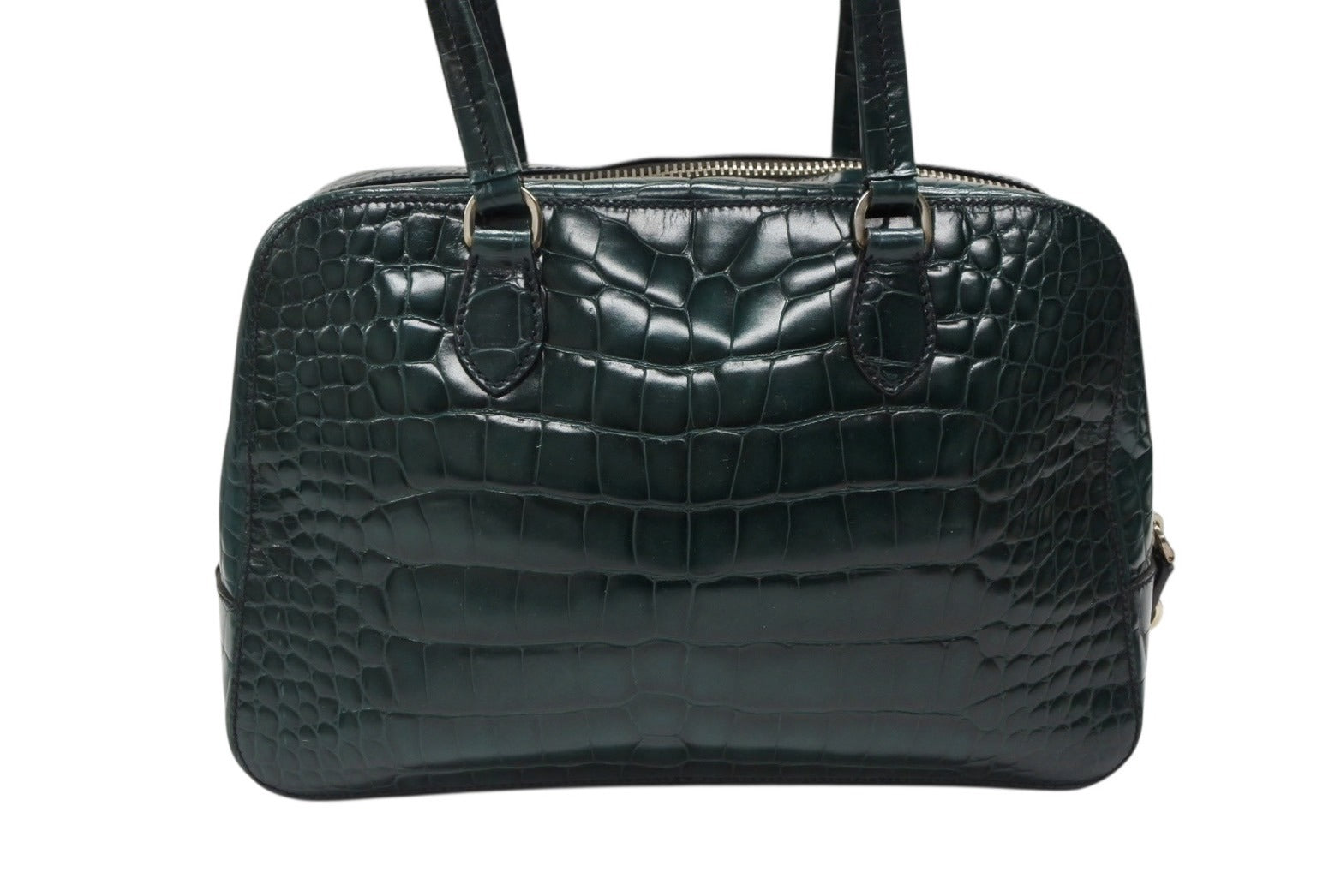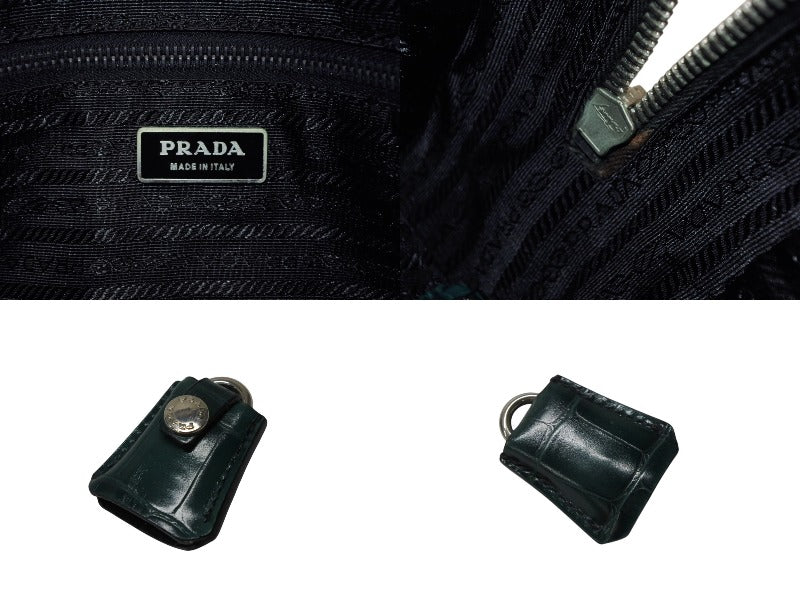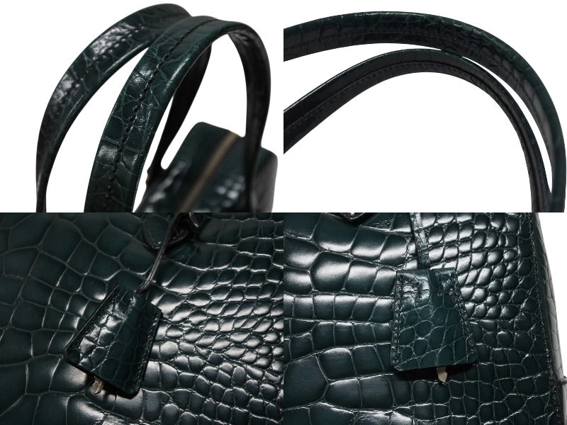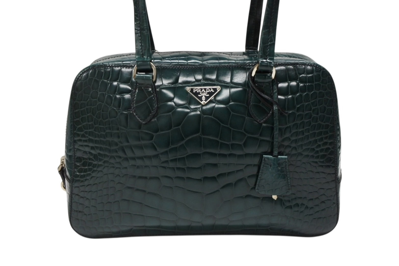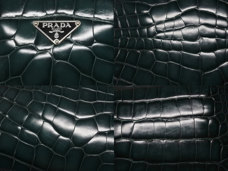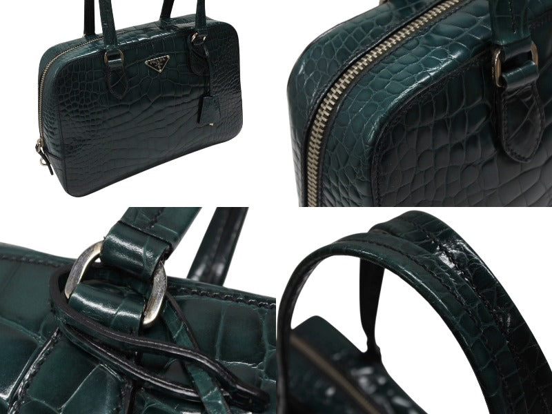 極美品 PRADA プラダ ハンドバッグ トートバッグ トライアングルロゴ クロコダイル型押しレザー グリーン シルバー金具 中古 4b007331