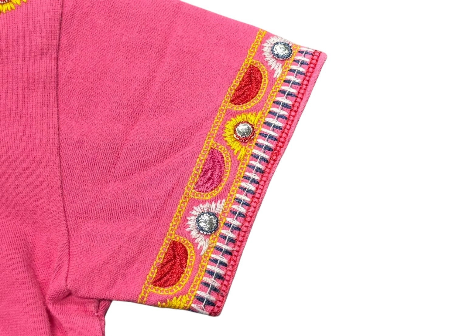 鮮やかなピンクで、フロントにスタッズが散りばめられていて可愛いです。