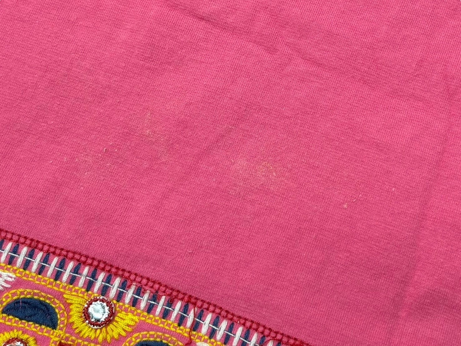 全体的に毛羽立ちあり。フロントのスタッズ部分に剥げあり。クルーネック部分に汚れあり。背面下部に黄ばみあり。中古品としてご使用いただける状態です。