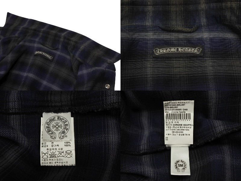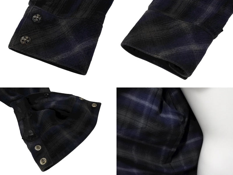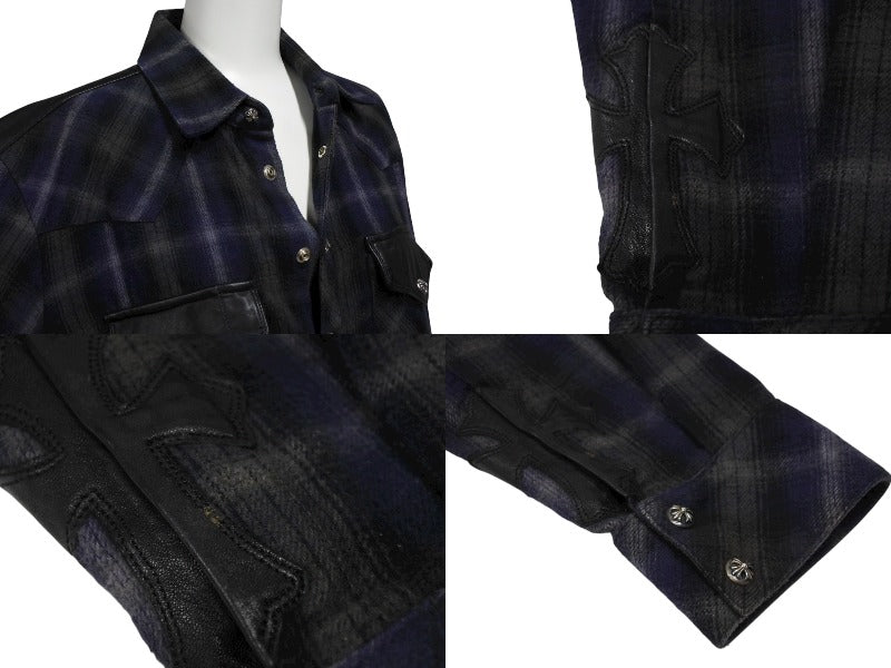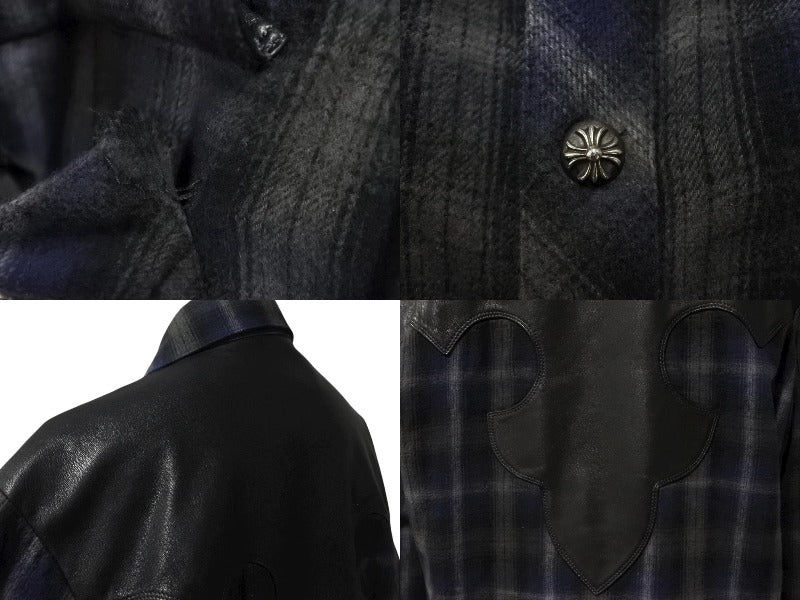 CHROME HEARTS クロムハーツ レザー切り替え 長袖ネルシャツ サイズSM フレアニー クロスボールボタン チェック柄 美品 中古 4b008920