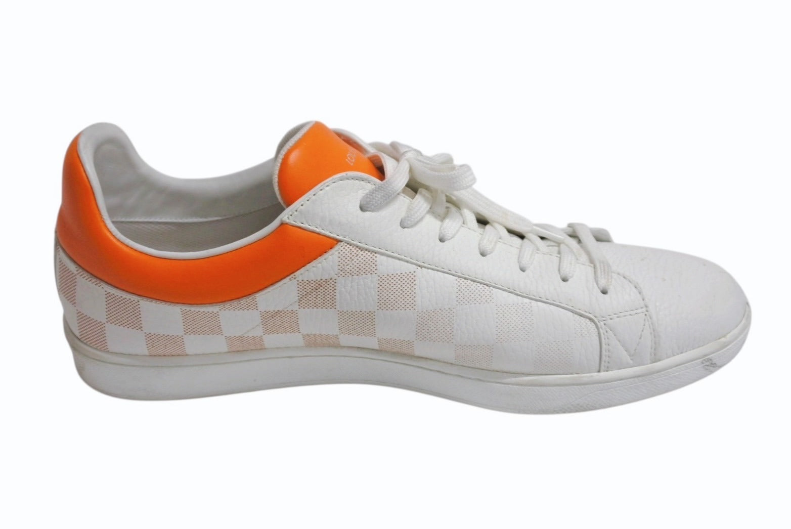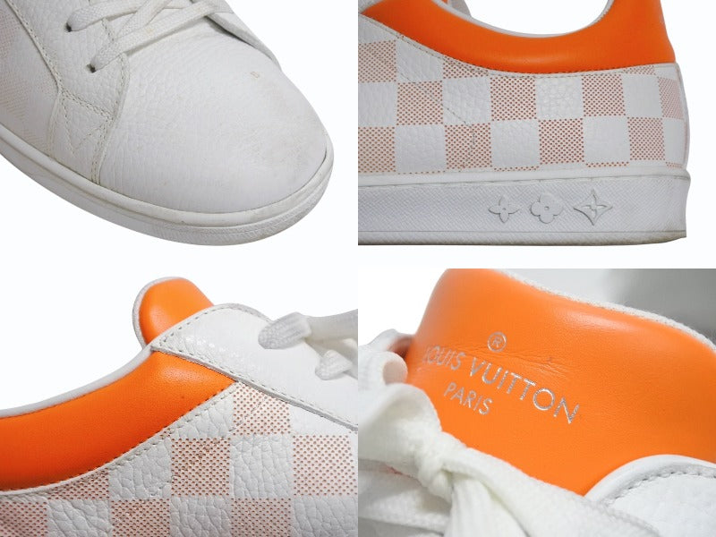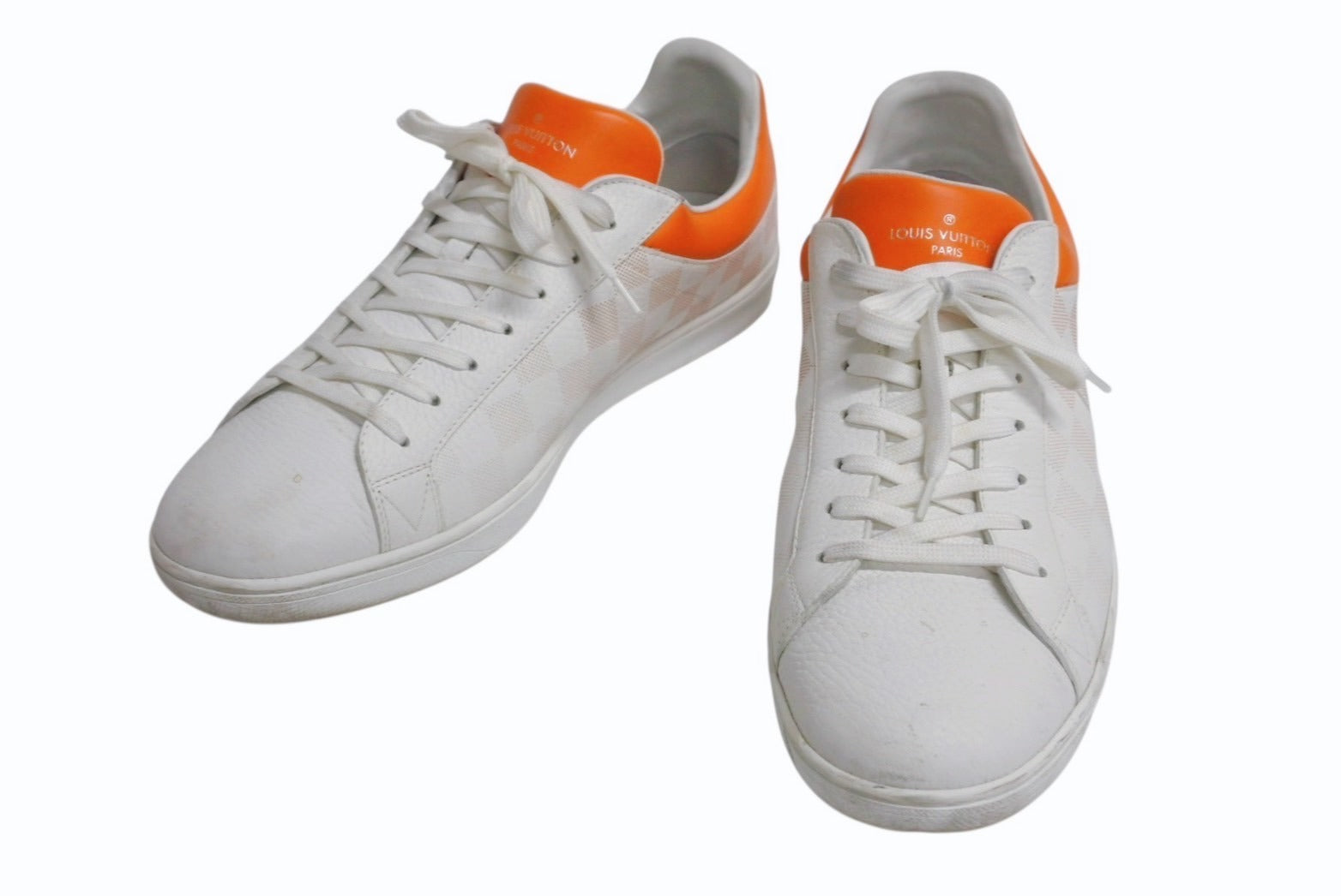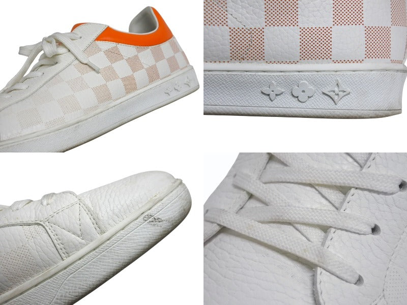 白のレザースニーカーにオレンジ色のダミエ柄が使用されています。