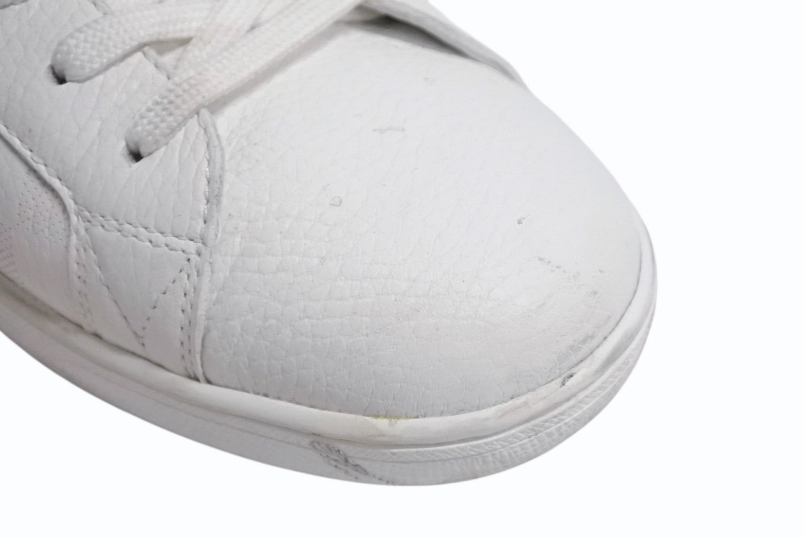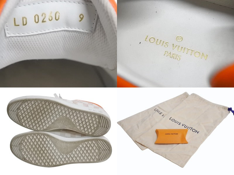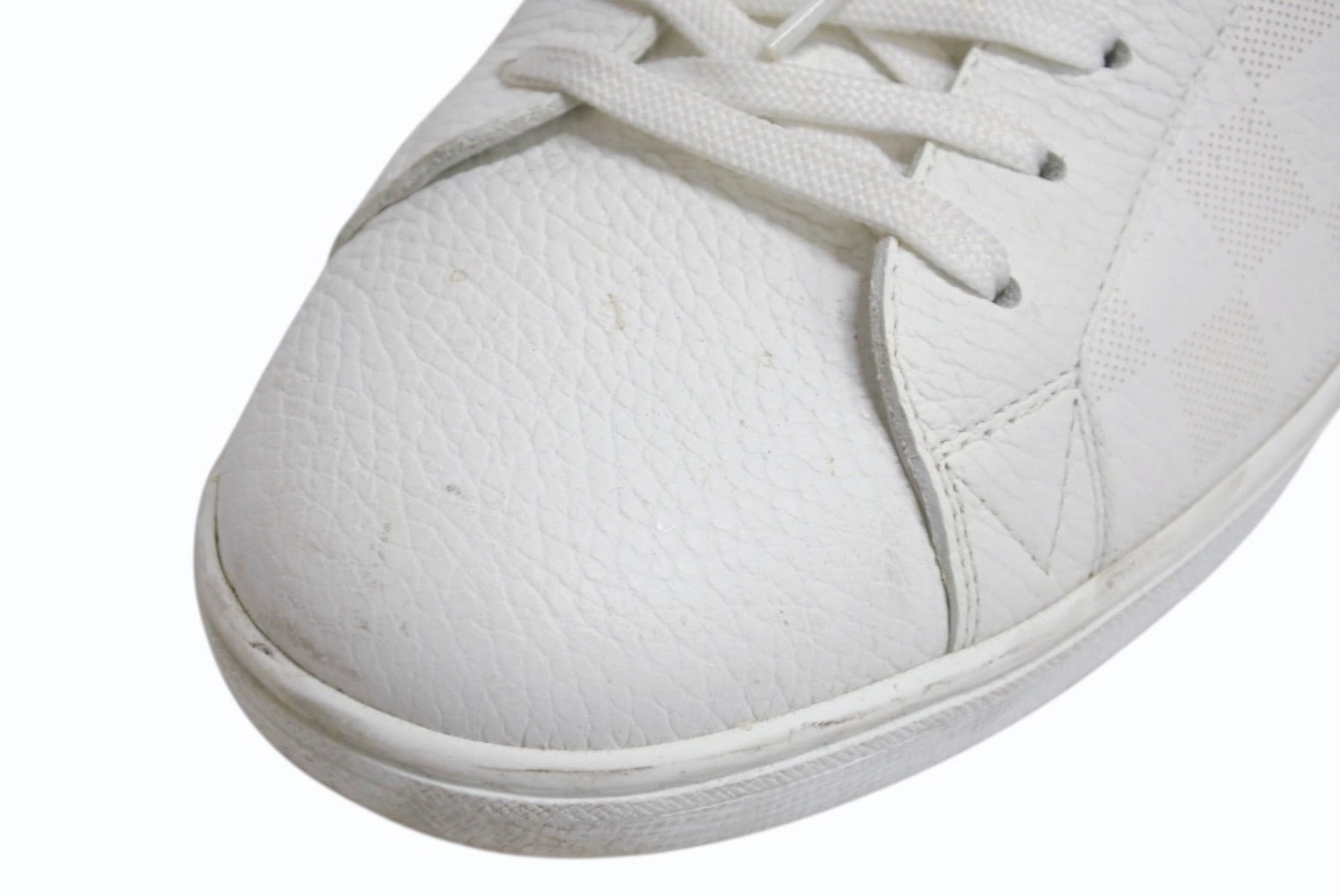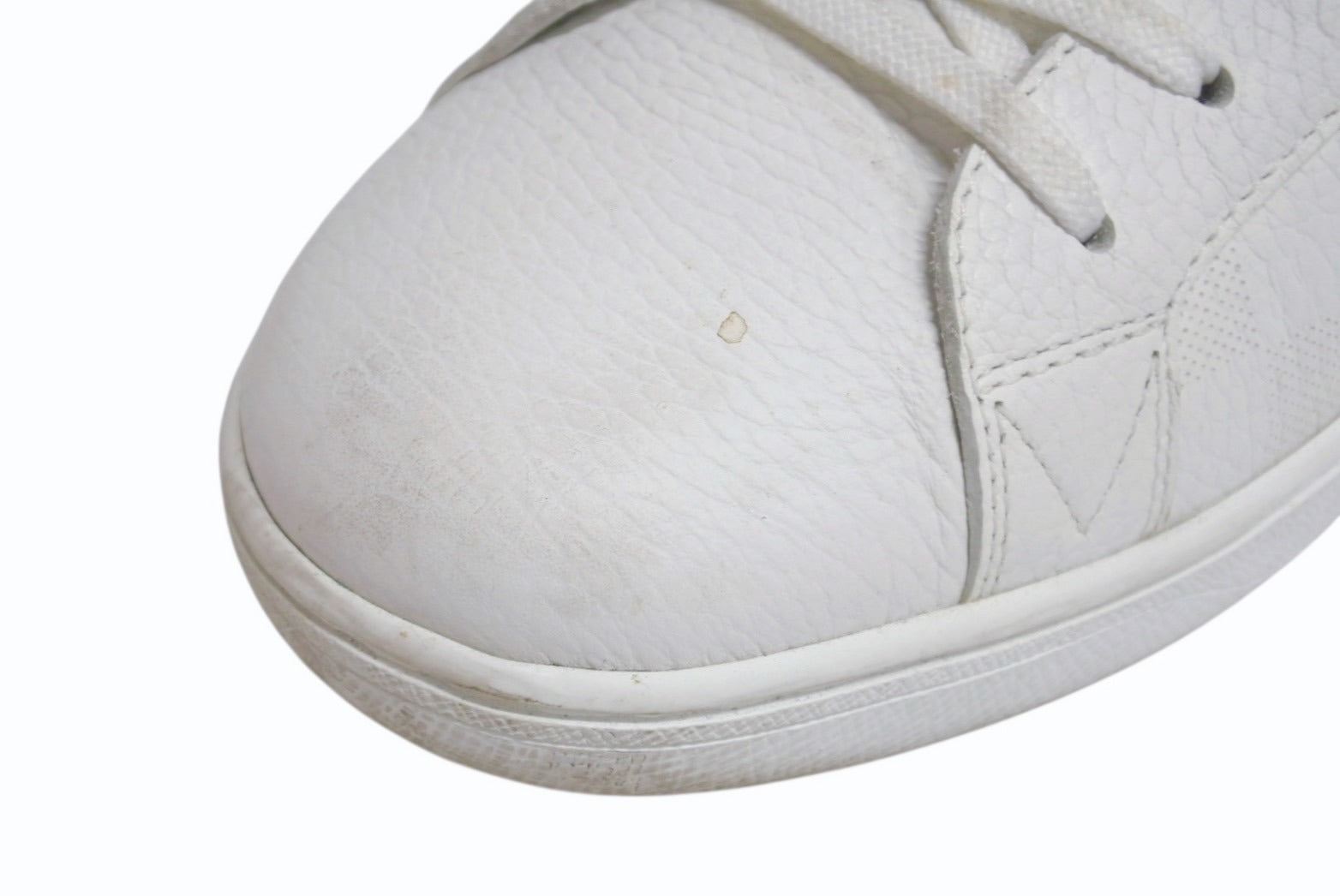 白のレザースニーカーにオレンジ色のダミエ柄が使用されています。