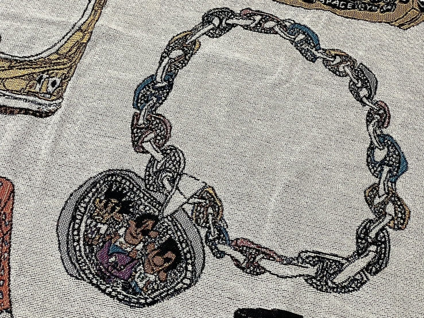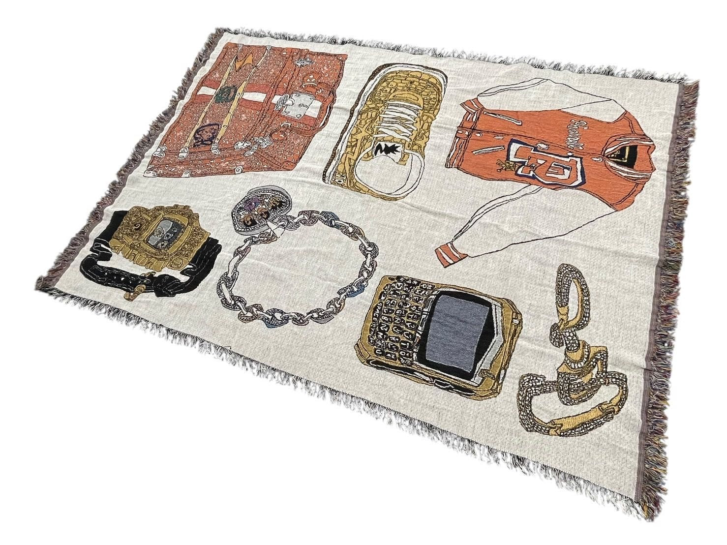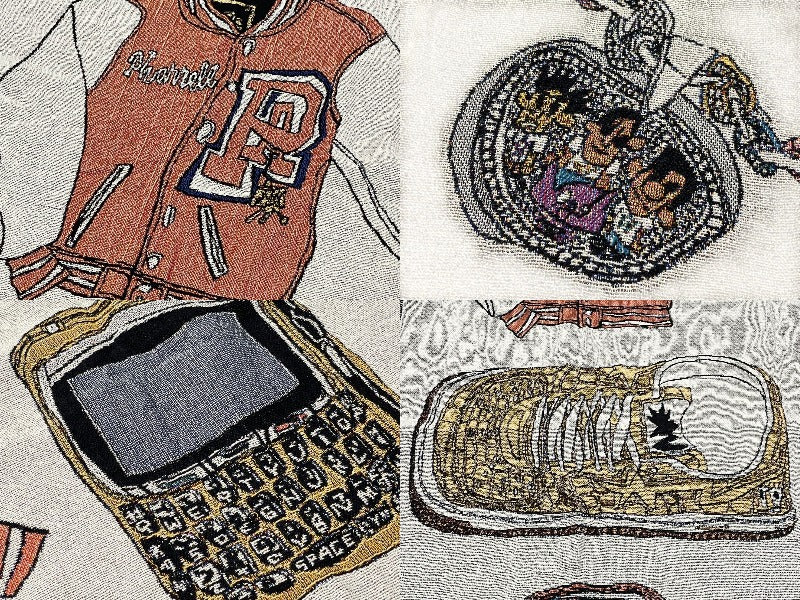 ブラックベリー8700、ファレル私物ジャケット、Jacob & Co. N.E.R.Dペンダントチェーン、カシオ G-Shock by BAPE DW-6900、ゴヤール トランク、BAPE Sta スポンジボブ スニーカー、Jacob & Co. カラビナキーリングなどのファレルウィリアムスの私物を画家の落合翔平が描き下ろしたアイテムです。