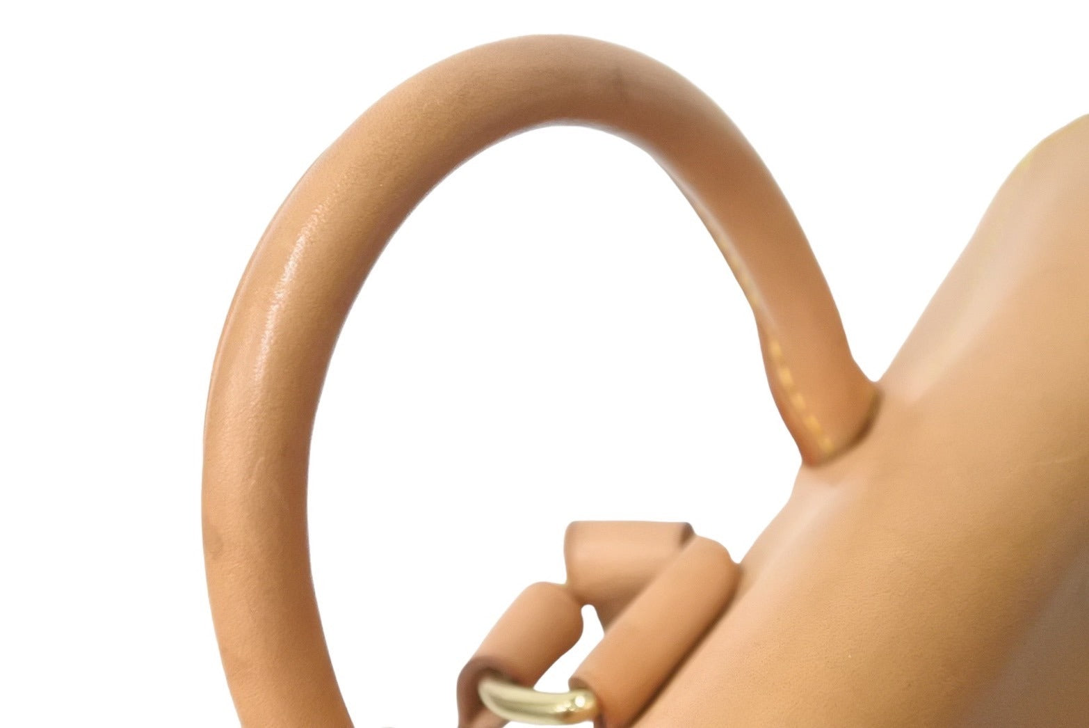 ヌメ革全体的にヤケと傷あり。ハンドルコバ部分毛羽立ちあり。ショルダーヨレあり。内側付着汚れと毛羽立ちあり。角スレあり。