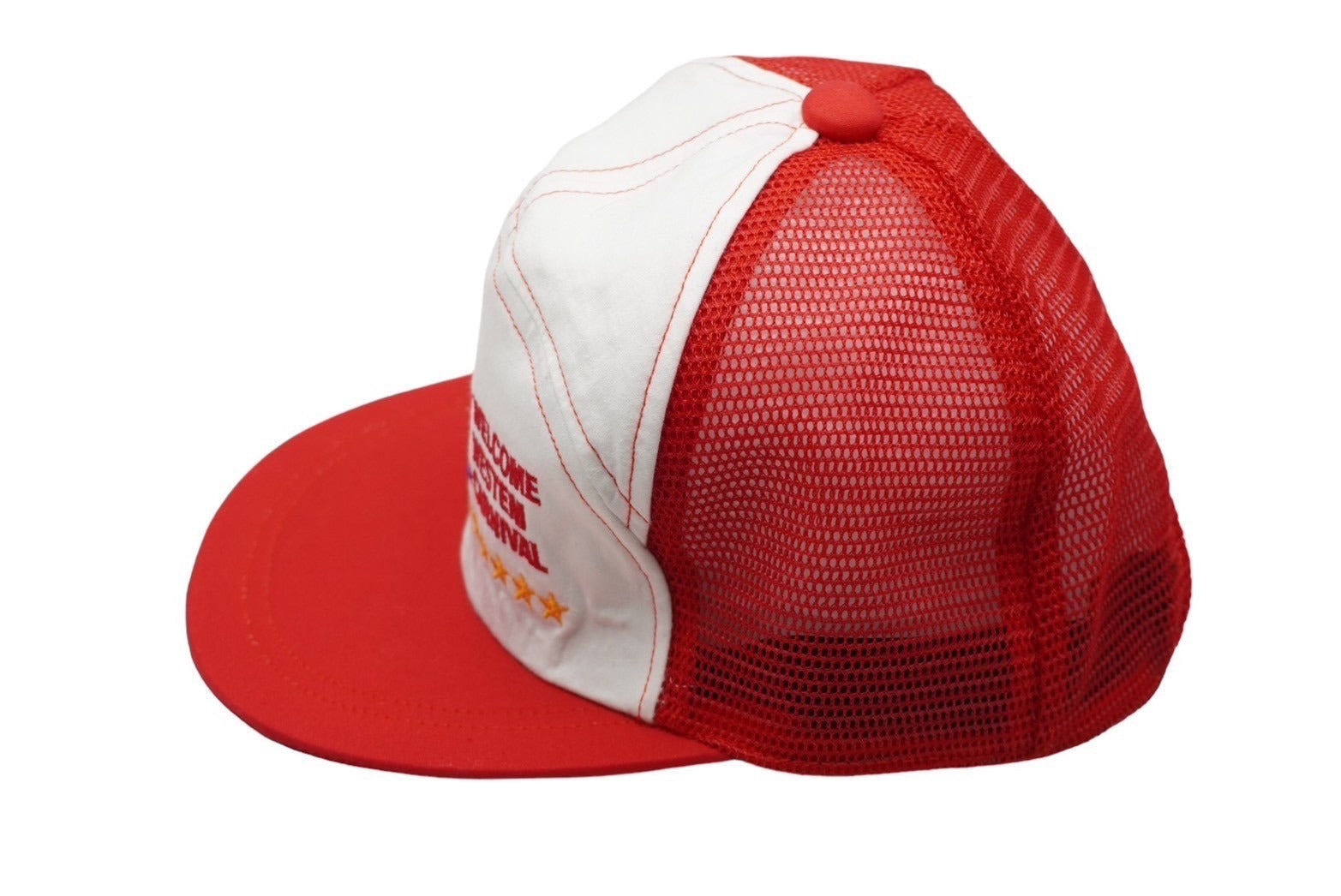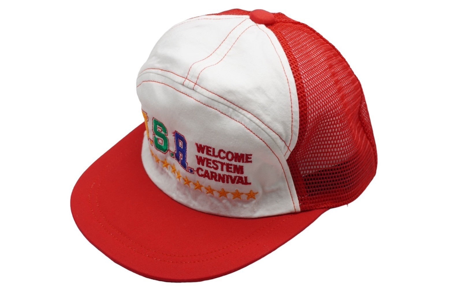 U.S.A WELCOME WESTEM CARNIVAL メッシュ キャップ レッド 帽子 刺繍 ホワイト ナイロン 56CM 美品 中古 60527