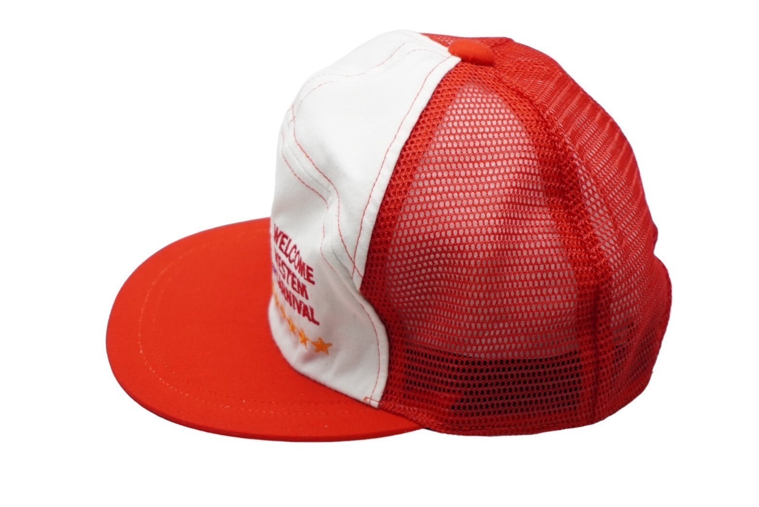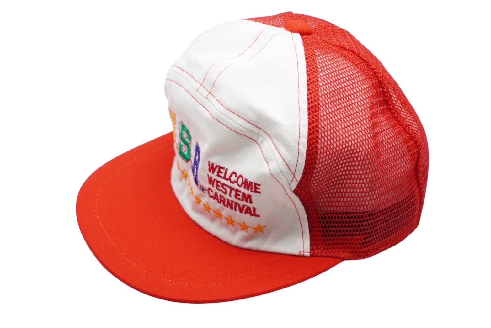 極美品 U.S.A WELCOME WESTEM CARNIVAL メッシュ キャップ レッド 帽子 刺繍 ホワイト ナイロン 54CM 中古 60737