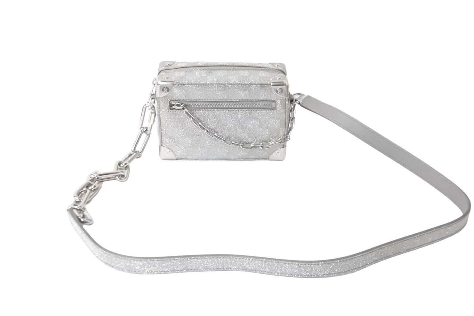 22SSシーズンのダミエ・グリッター生地の光沢感のあるレザーにアイコニックなダミエ・パターンをエンボス加工したバックです。