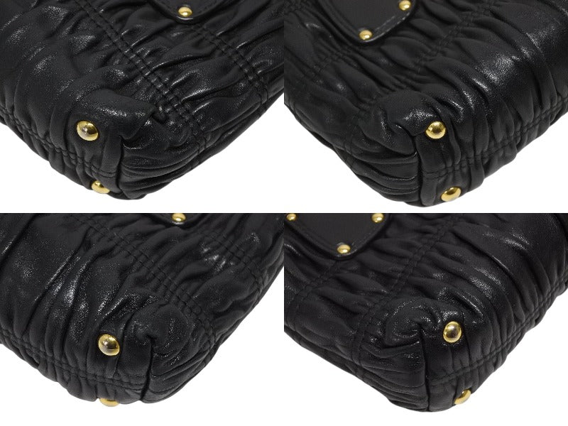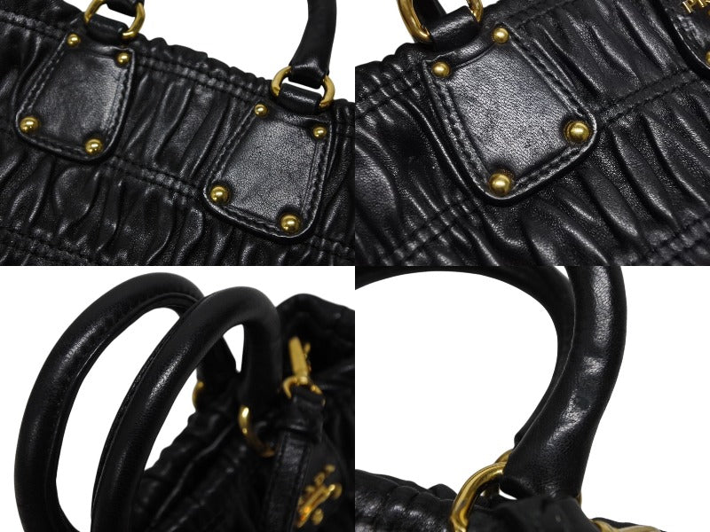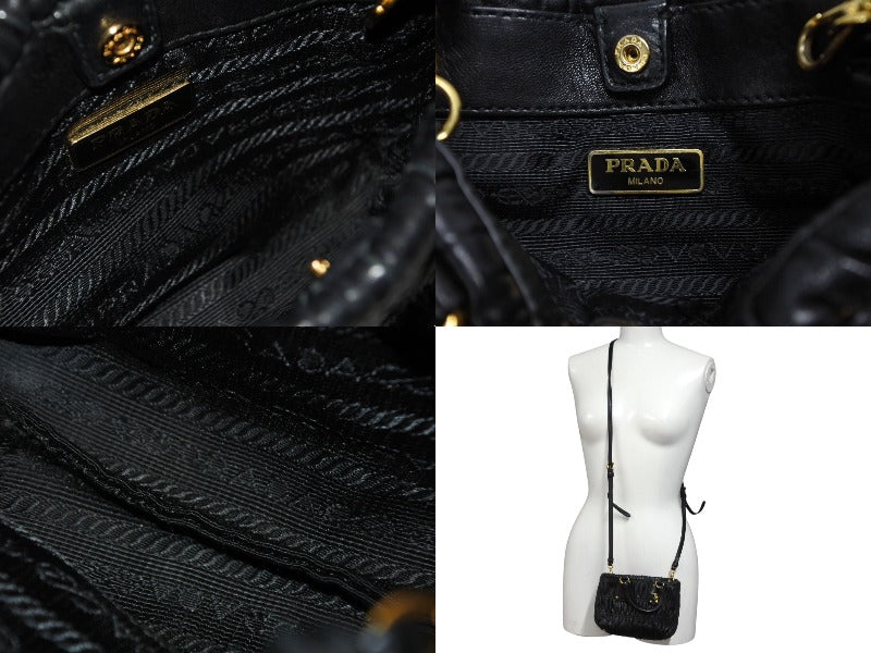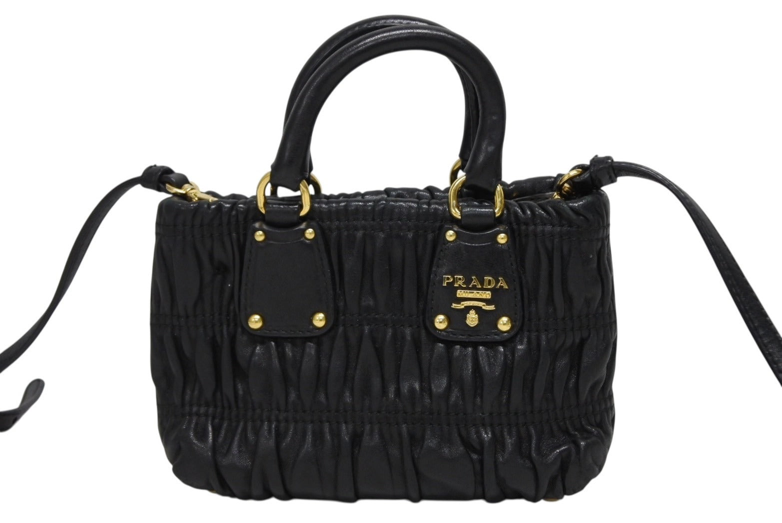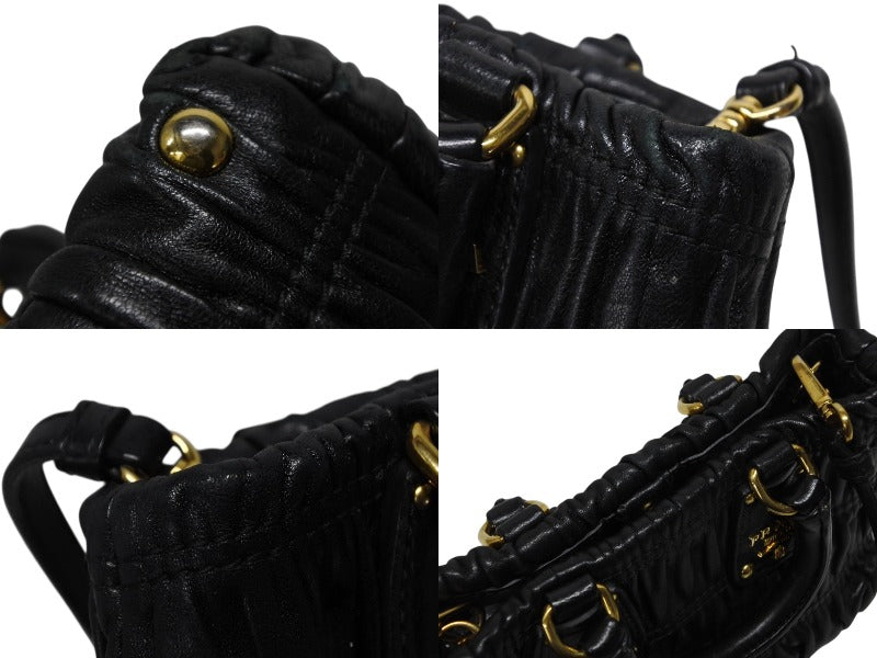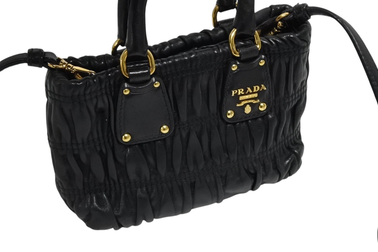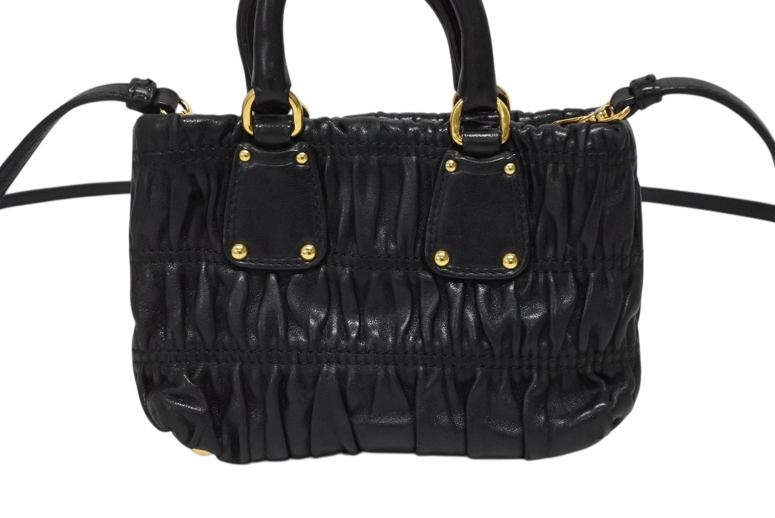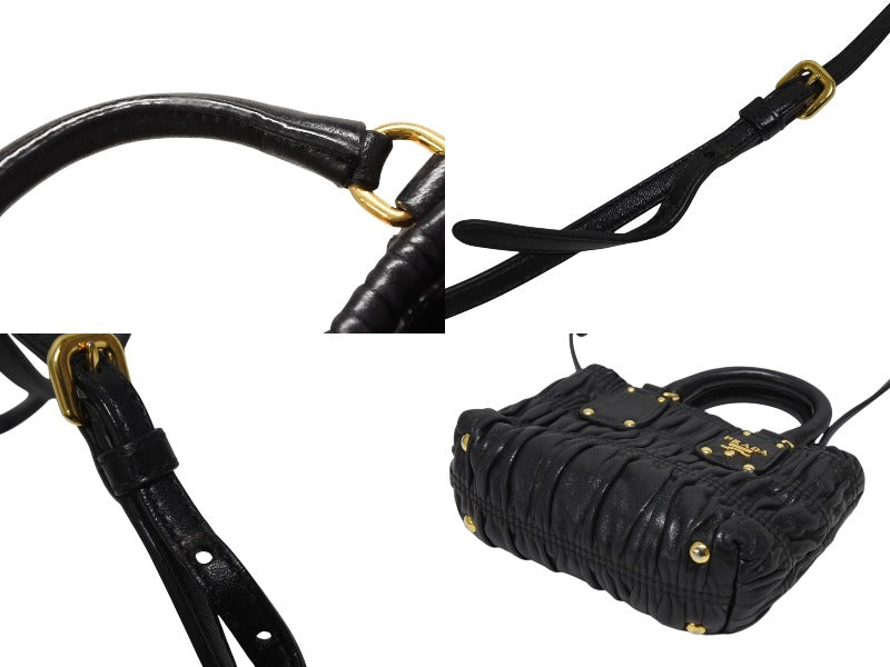 PRADA プラダ プリーツデザイン 2WAY ミニハンドバッグ ショルダーバッグ ロゴ レザー ブラック ゴールド金具 美品 中古 4b008959
