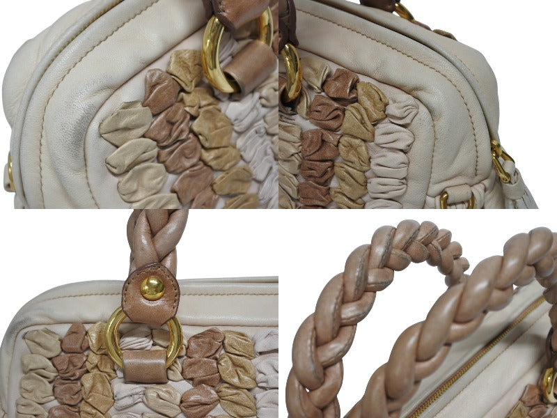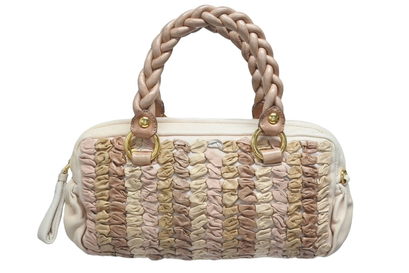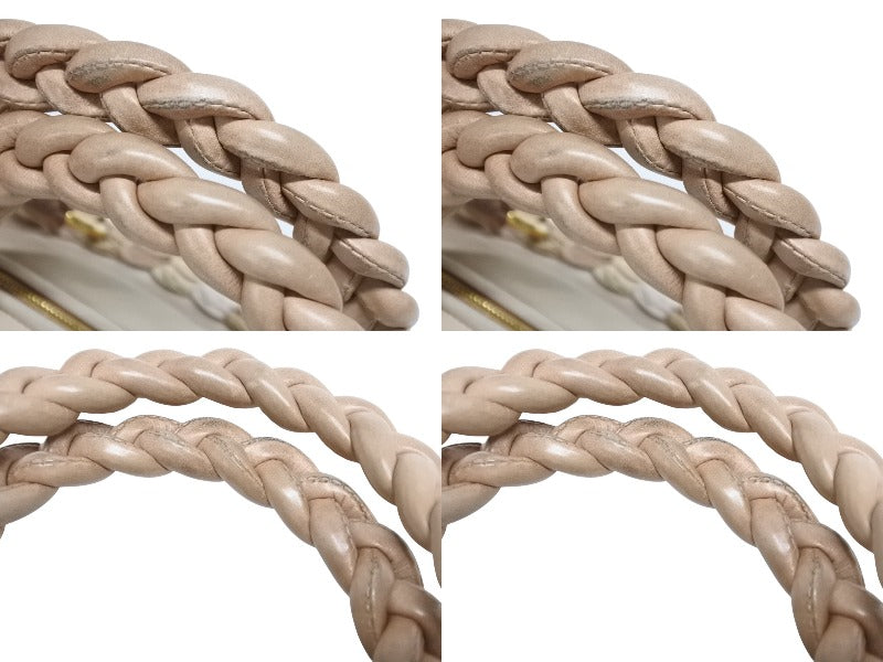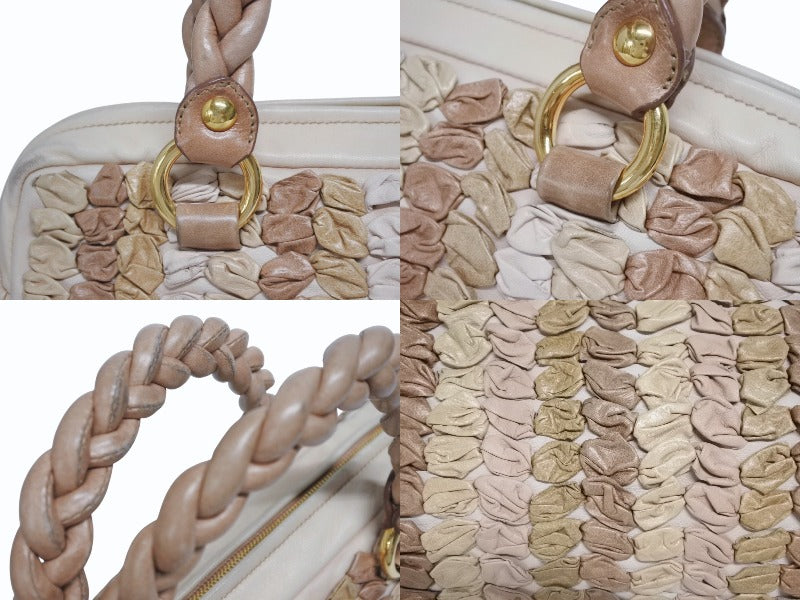 レザーの編み込みデザインが魅力のハンドバッグです。