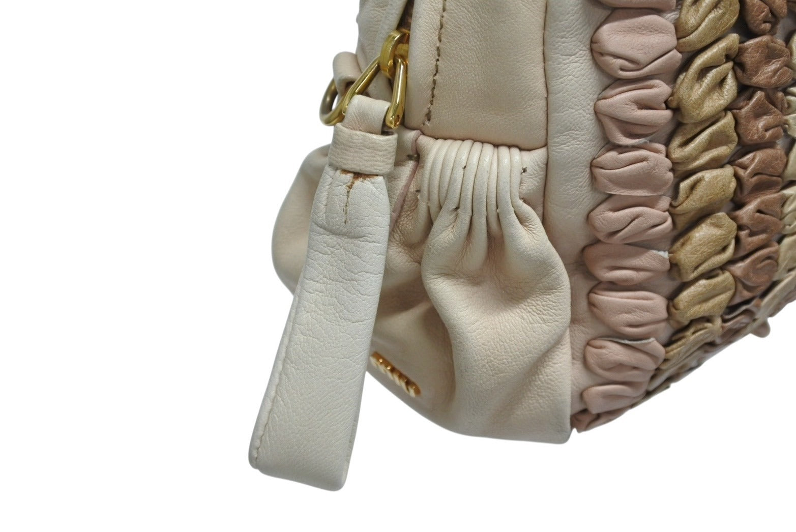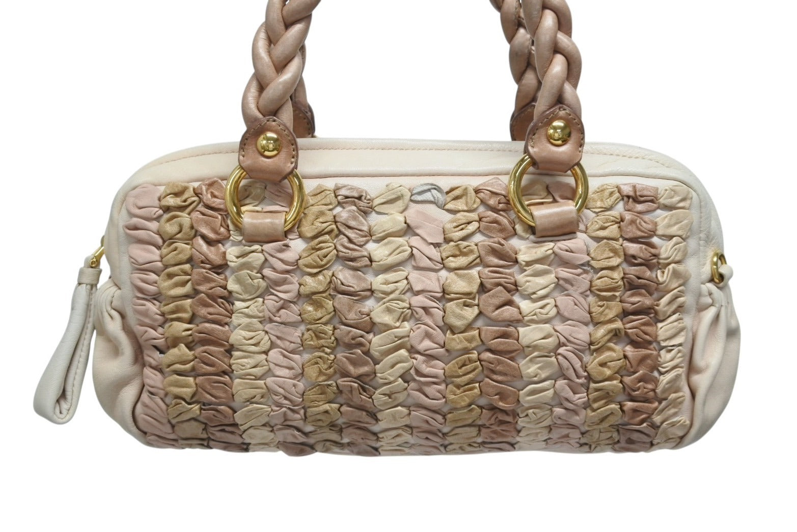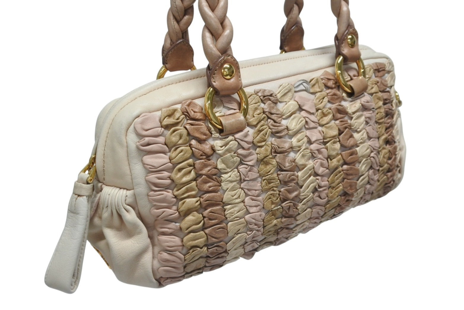 レザーの編み込みデザインが魅力のハンドバッグです。
