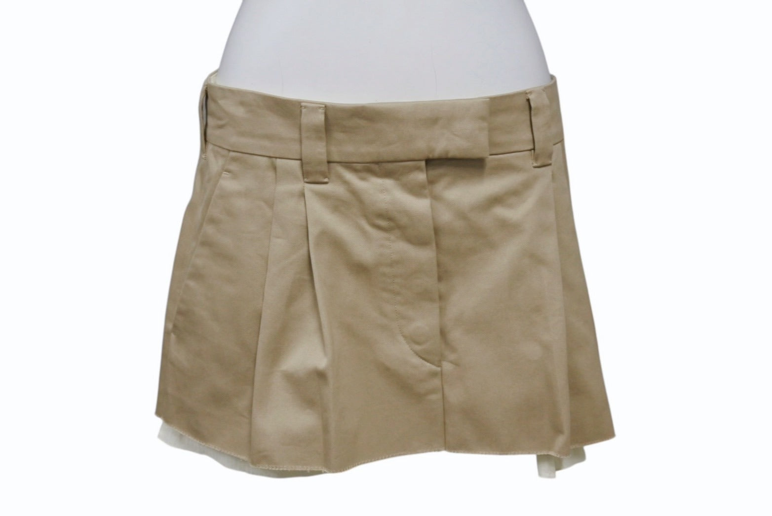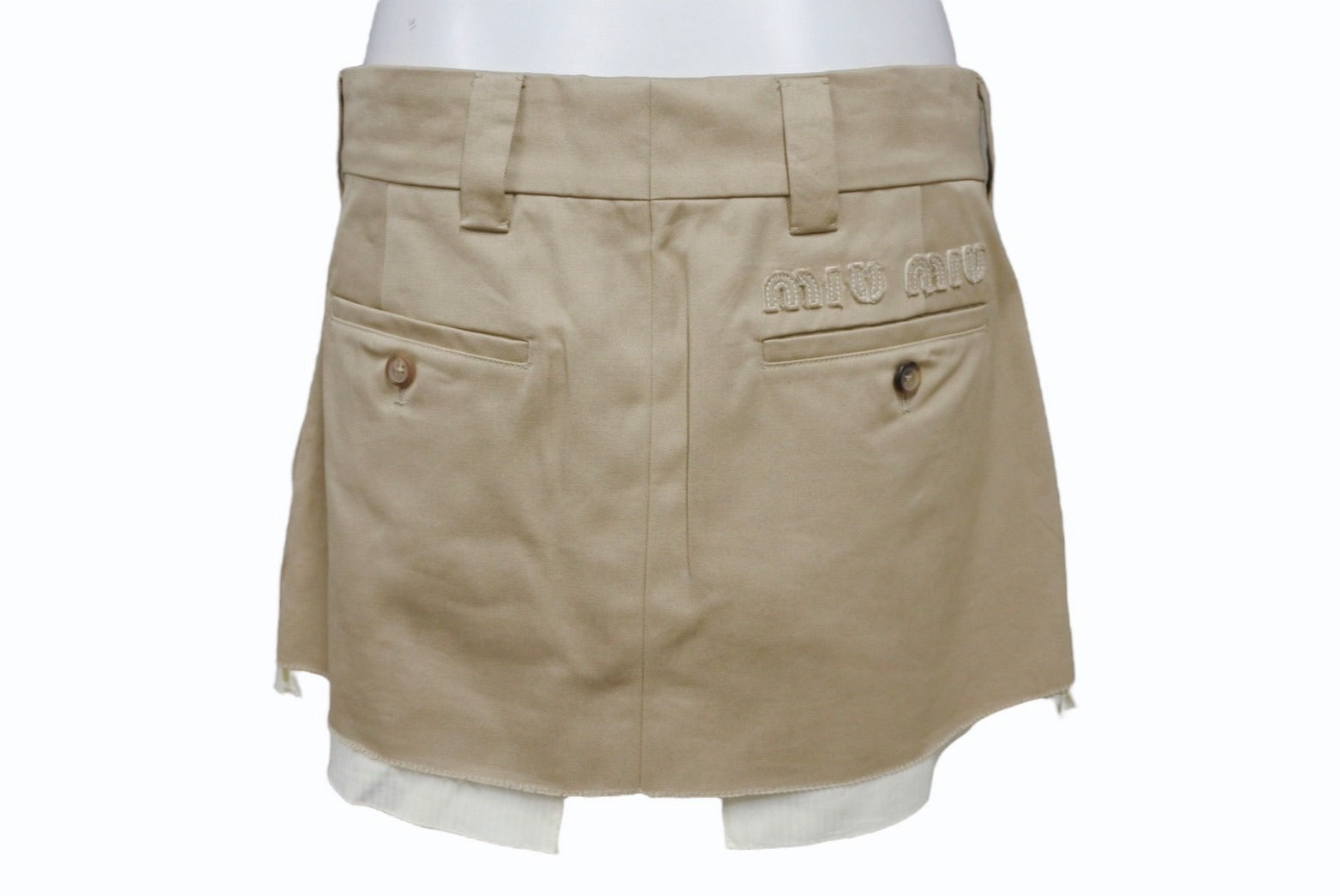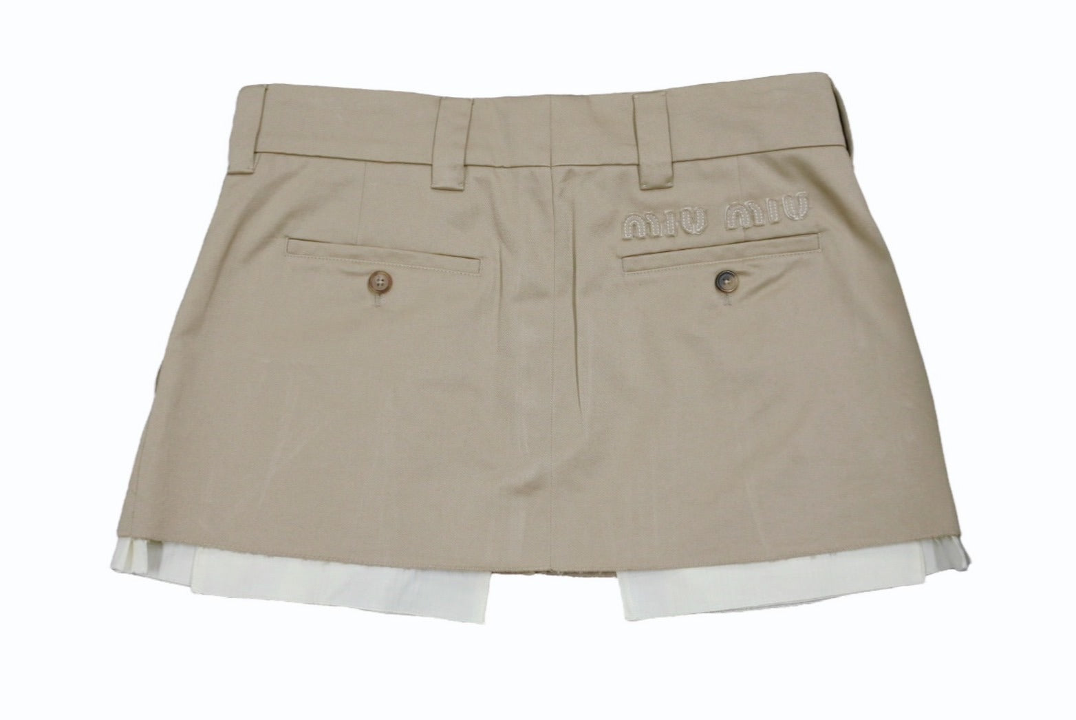 クラシックなテーラリングの常識を覆し、ミュウミュウの大胆なビジョンを一新。バランスを変えることで新しいプロポーションを静かに、新たな意味を与えたクラシックなレディスウェアのチノミニスカートです。