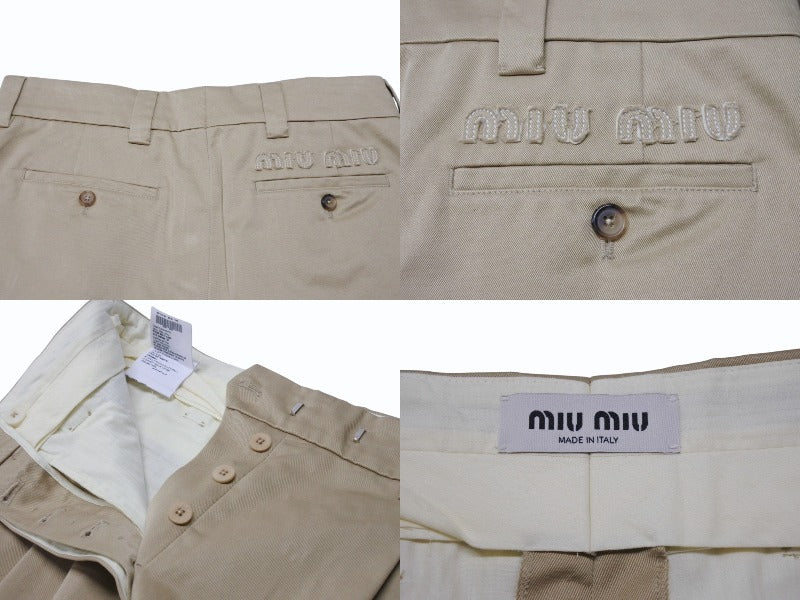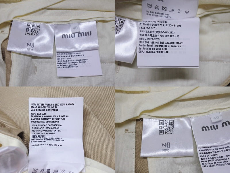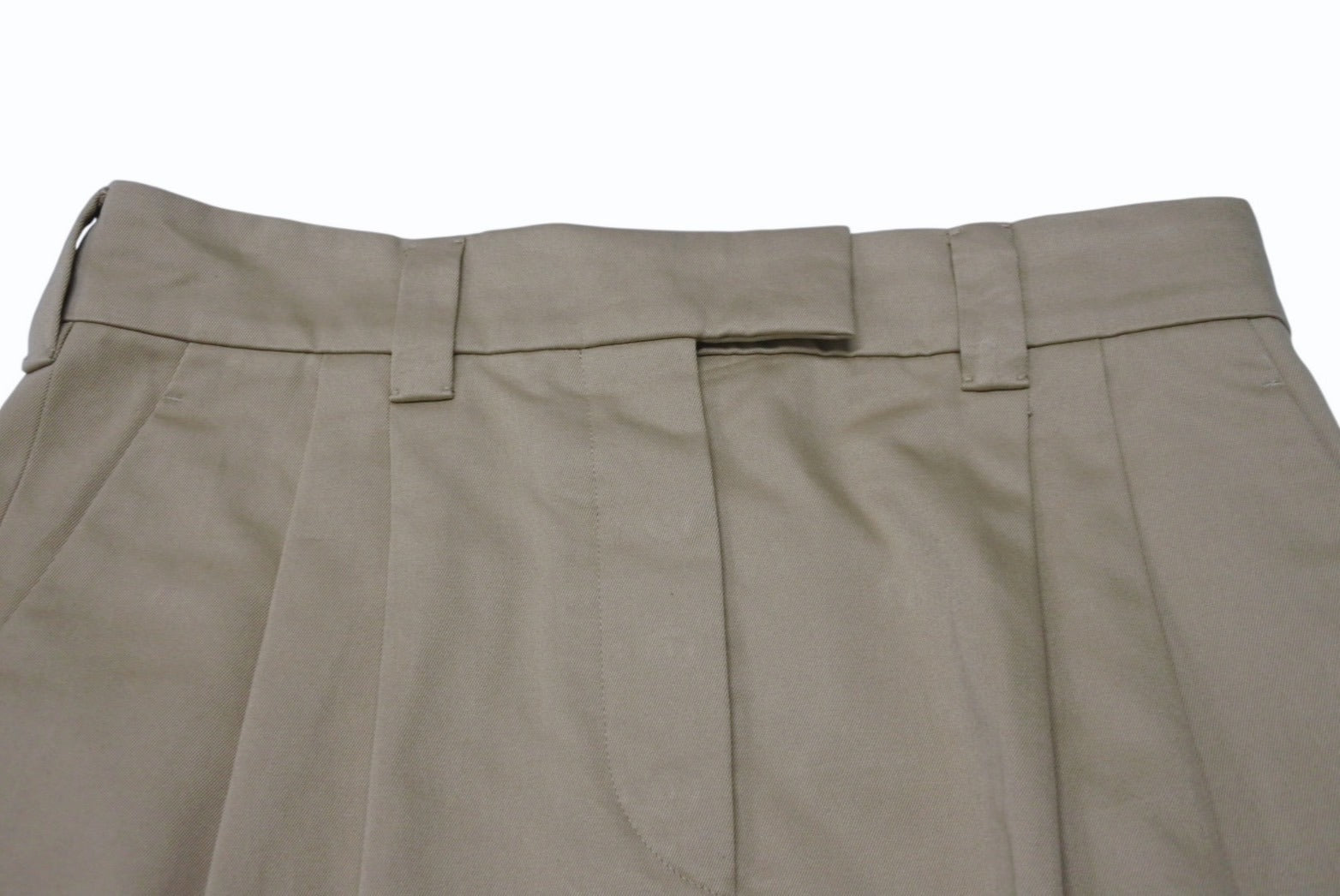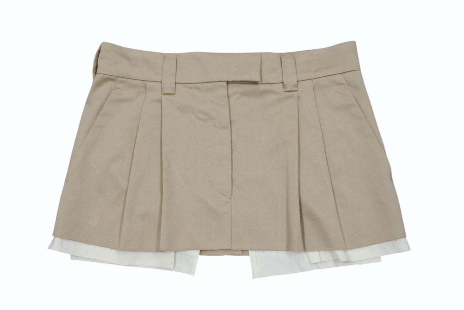 クラシックなテーラリングの常識を覆し、ミュウミュウの大胆なビジョンを一新。バランスを変えることで新しいプロポーションを静かに、新たな意味を与えたクラシックなレディスウェアのチノミニスカートです。