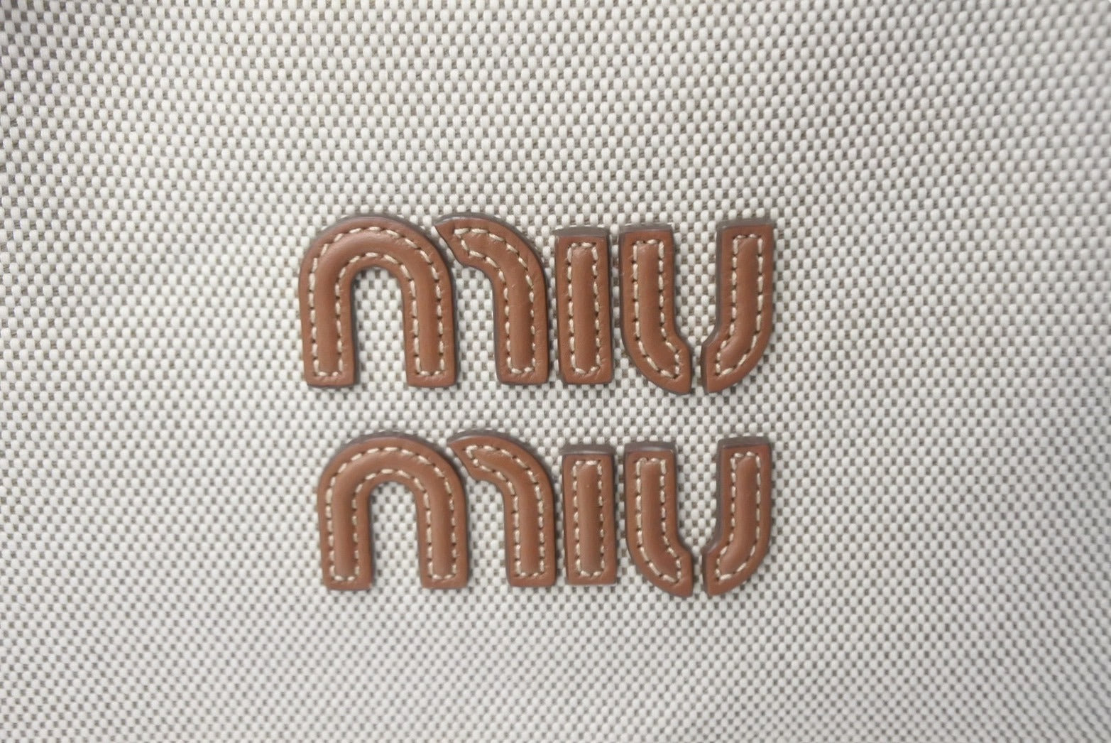 キャンバス地にレザーハンドルという素材とカラーのコントラストが特徴的なトップハンドルバッグ。MIU MIUロゴがアイコニックなタッチを添えるデザイン。