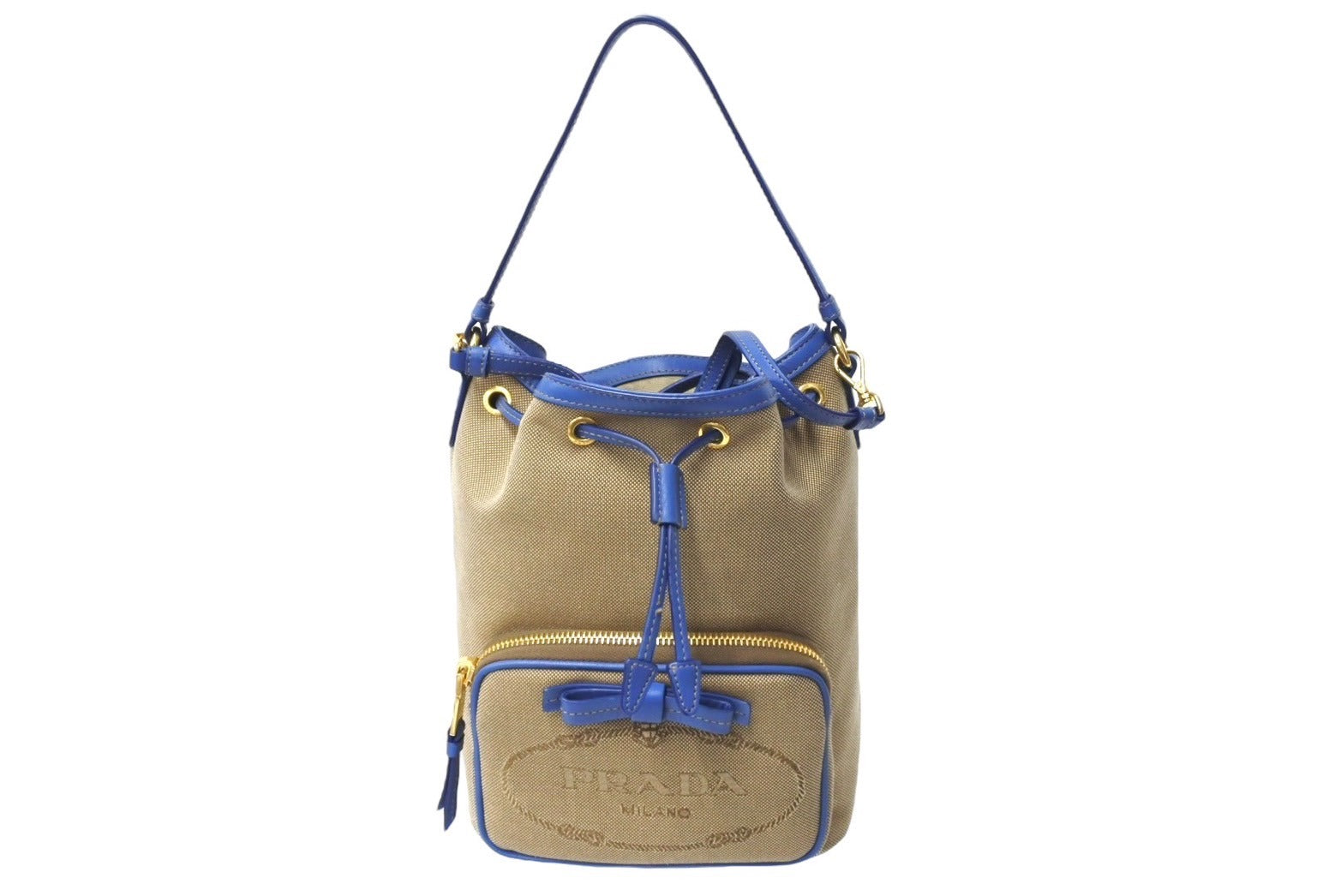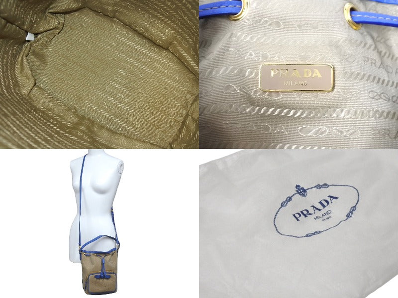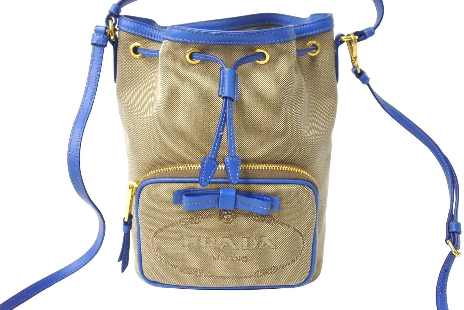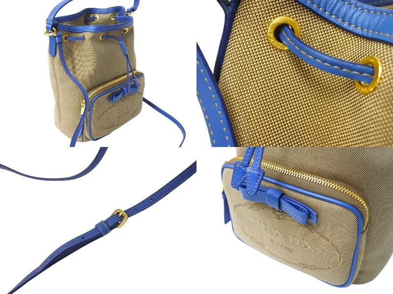 極美品 PRADA プラダ 2wayショルダーバッグ ハンドバッグ 巾着 1BH038 キャンバス ジャガード ベージュ ブルー ゴールド 中古 4c067175