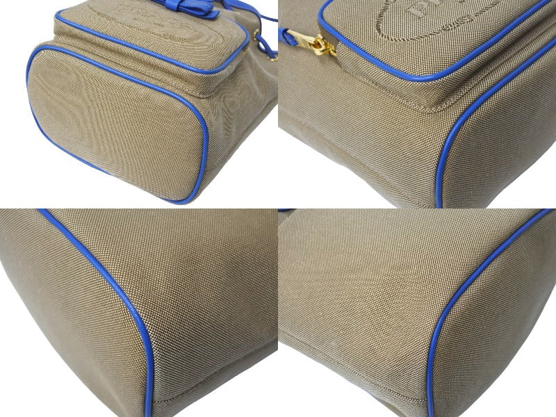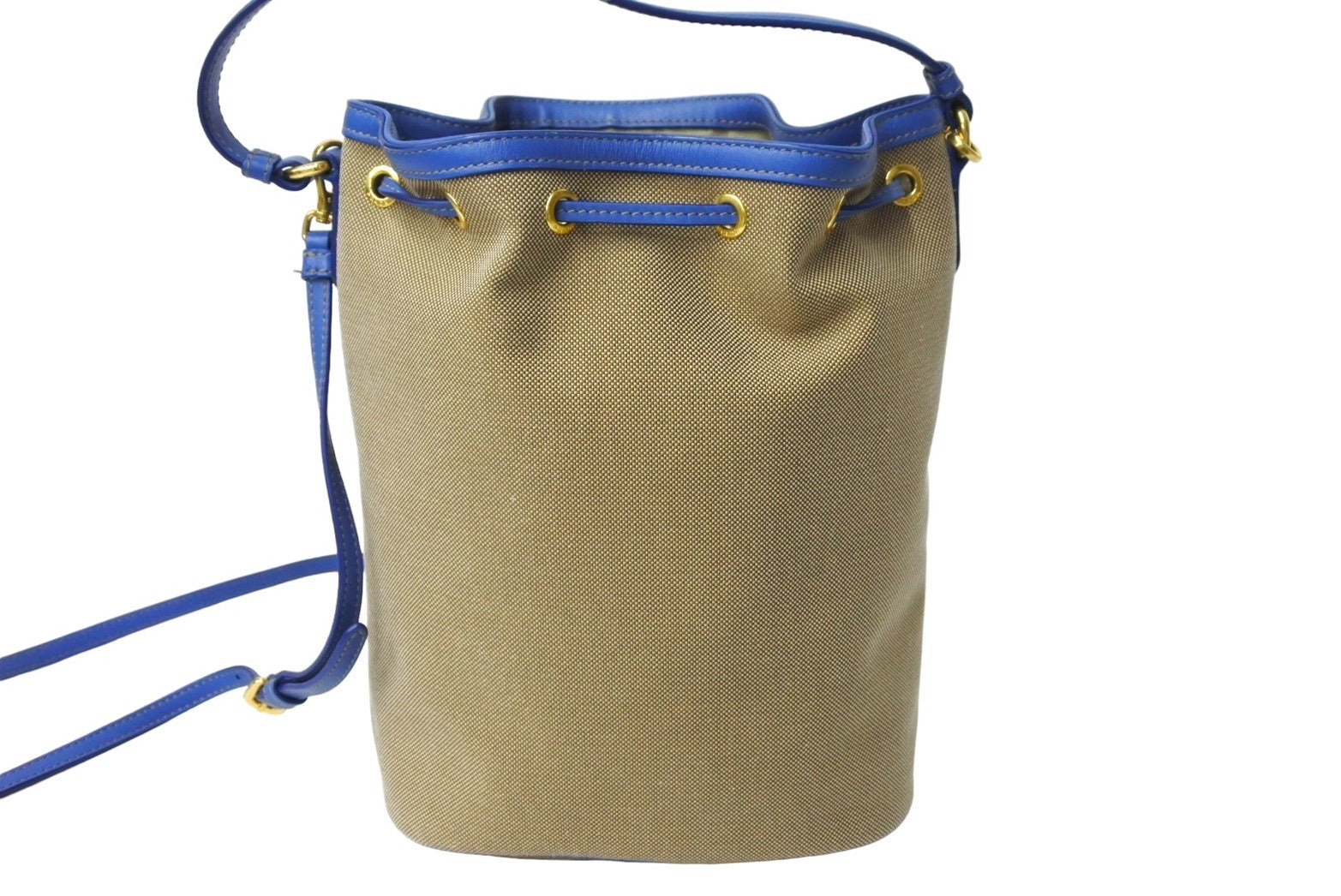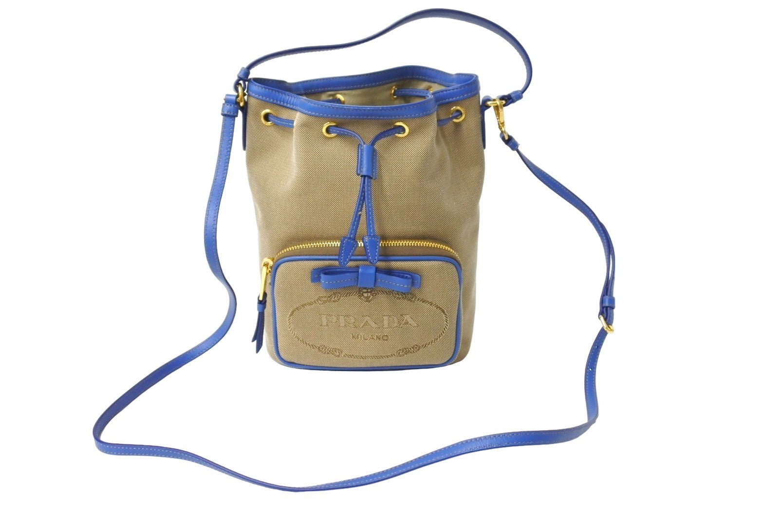 極美品 PRADA プラダ 2wayショルダーバッグ ハンドバッグ 巾着 1BH038 キャンバス ジャガード ベージュ ブルー ゴールド 中古 4c067175