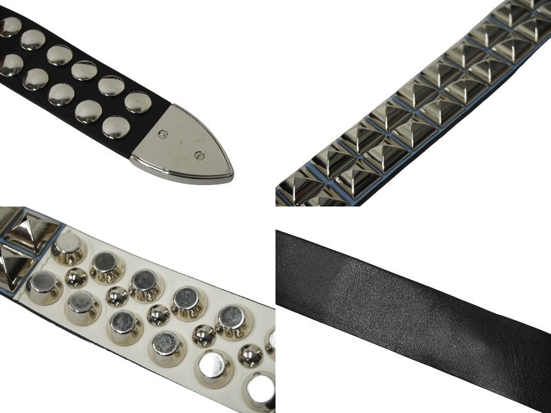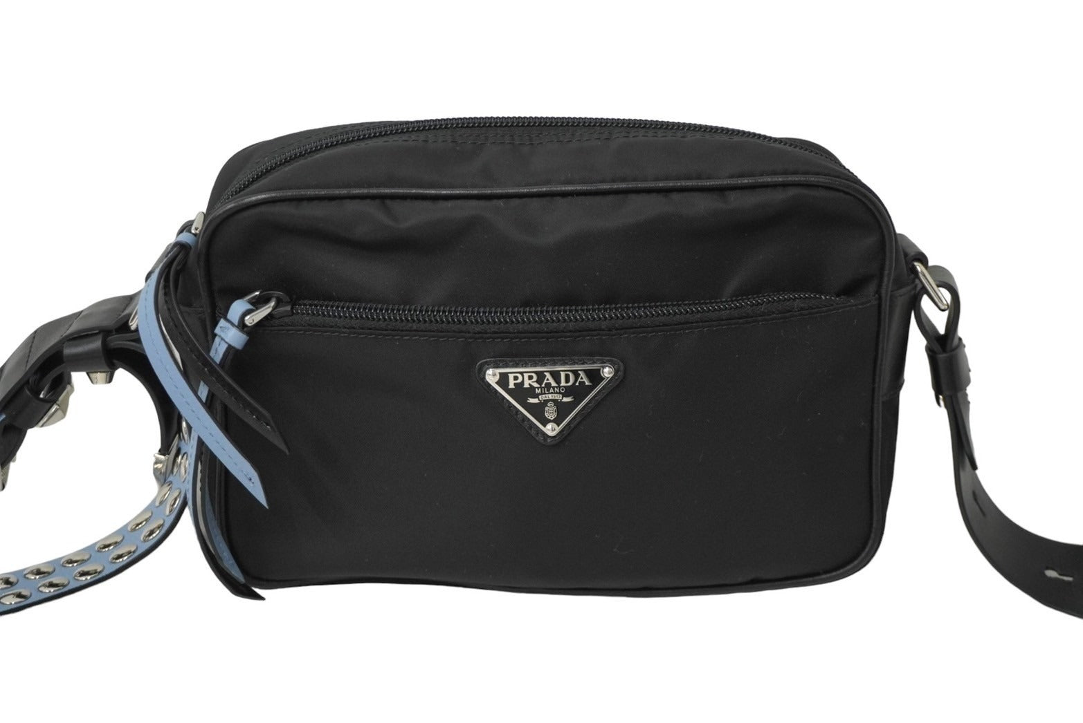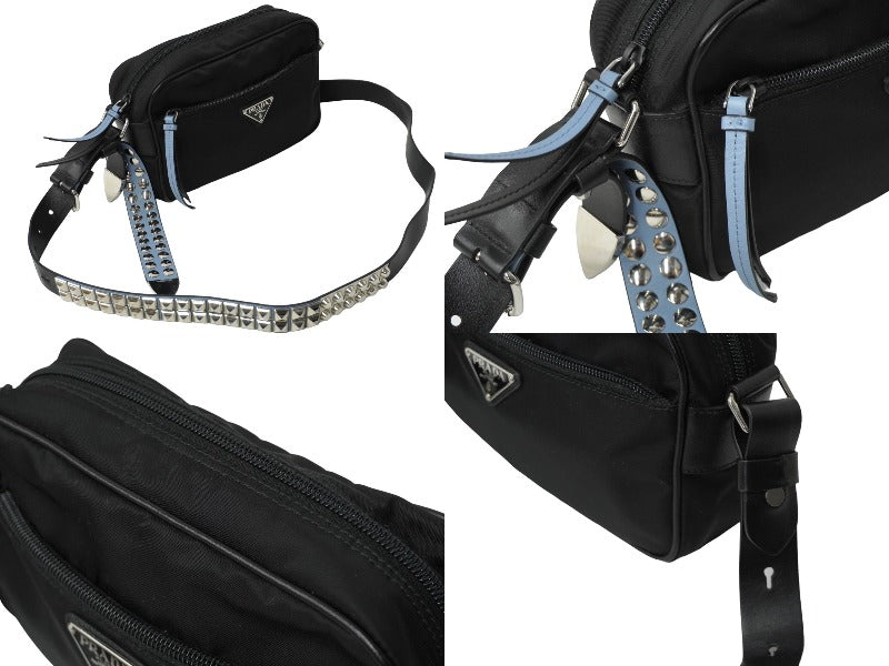 PRADA プラダショルダーバッグ トライアングルロゴ スタッズ ナイロン牛革 ブラック ブルー 1BC167 シルバー金具 美品 中古62019