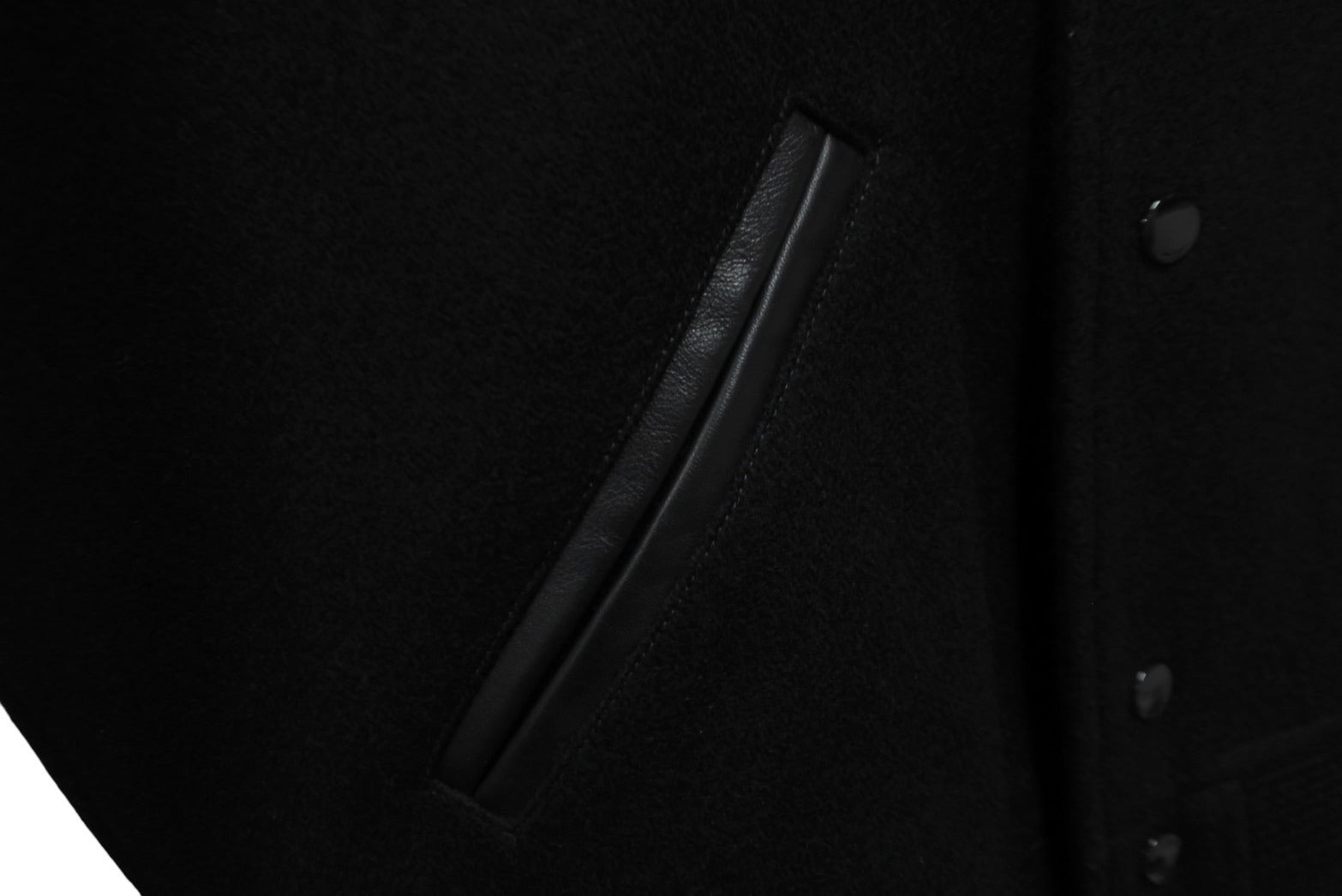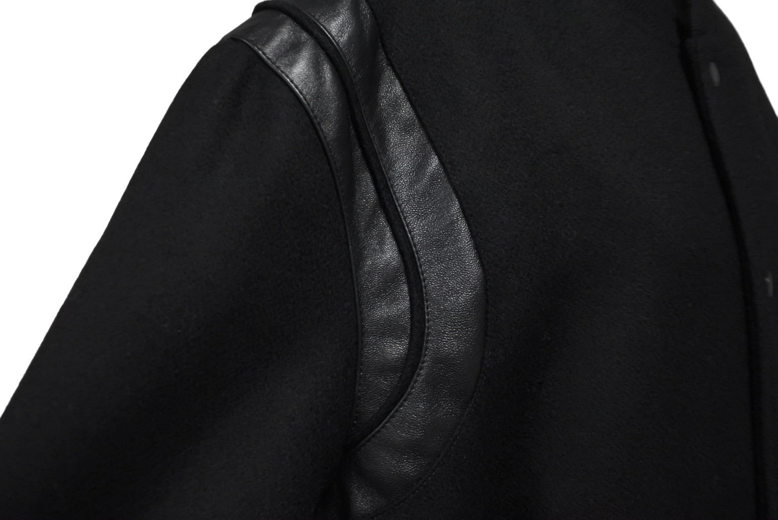 肩周りのレザートリム、リブの編み襟、袖口、ウエストバンドが特徴的なジャケットです。