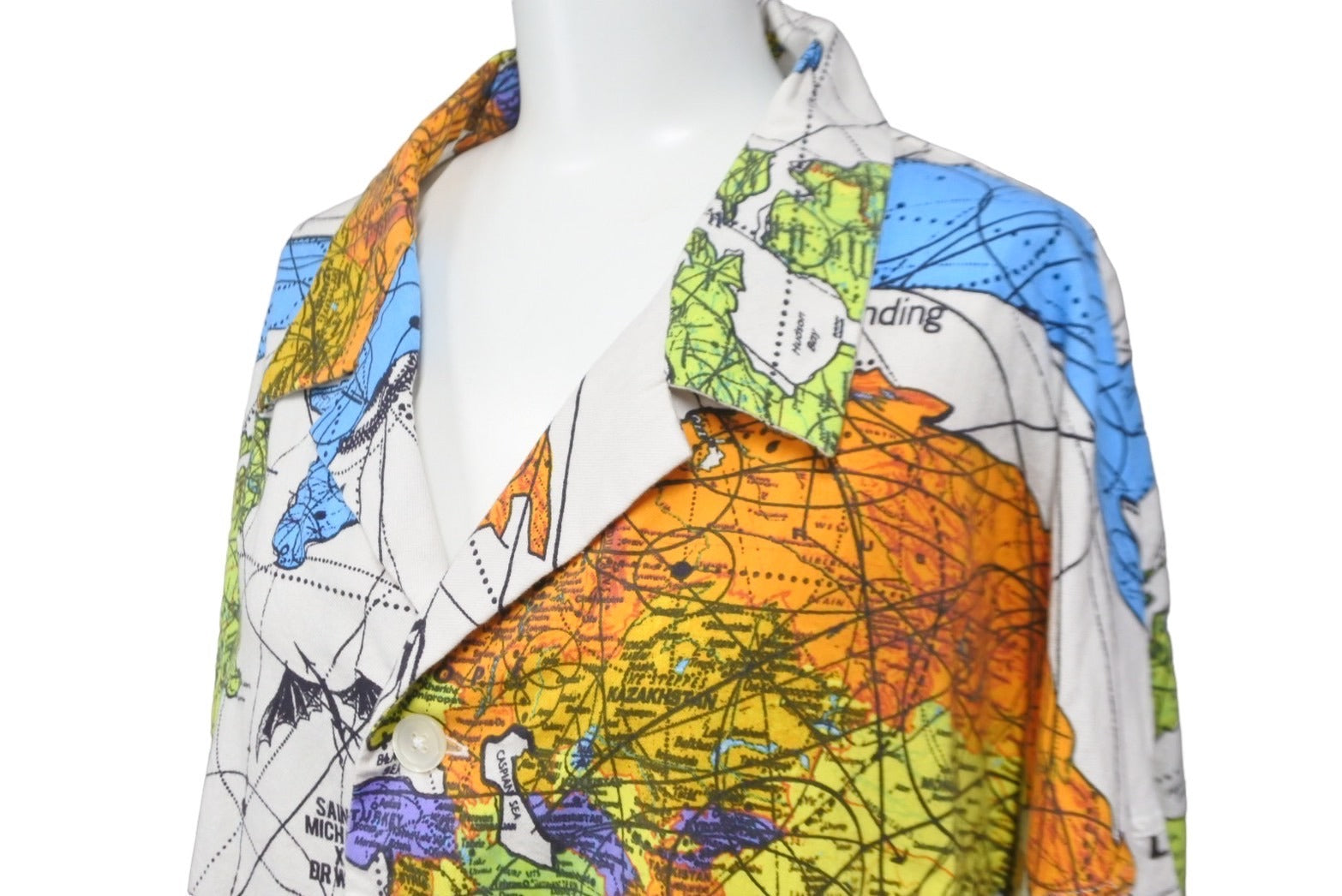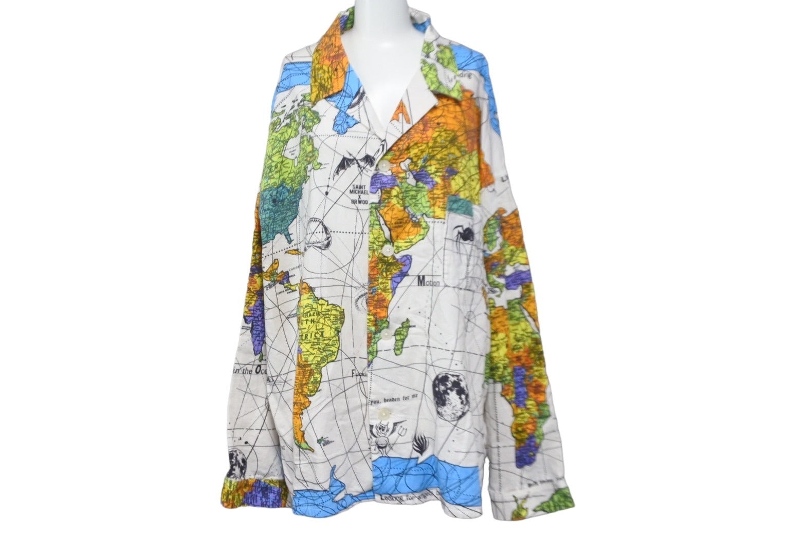 世界地図を全面にプリントした総柄仕様のパジャマシャツです。