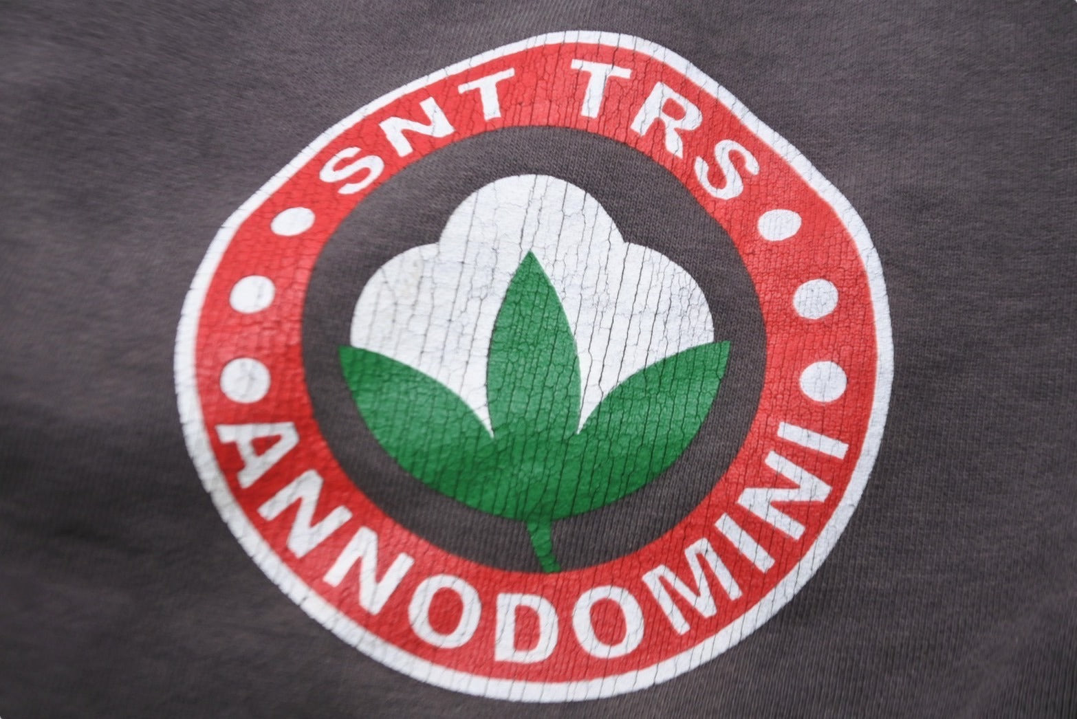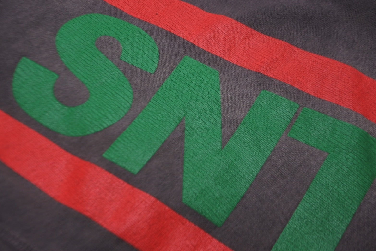 リアルなヴィンテージ感を表現するために、硫化染めとストーンウォッシュが実施されています。プリント部分は赤と緑のあたりで、フロントにはブランド名とオリジナルのデザインが大きくプリントされているオシャレなアイテムです。