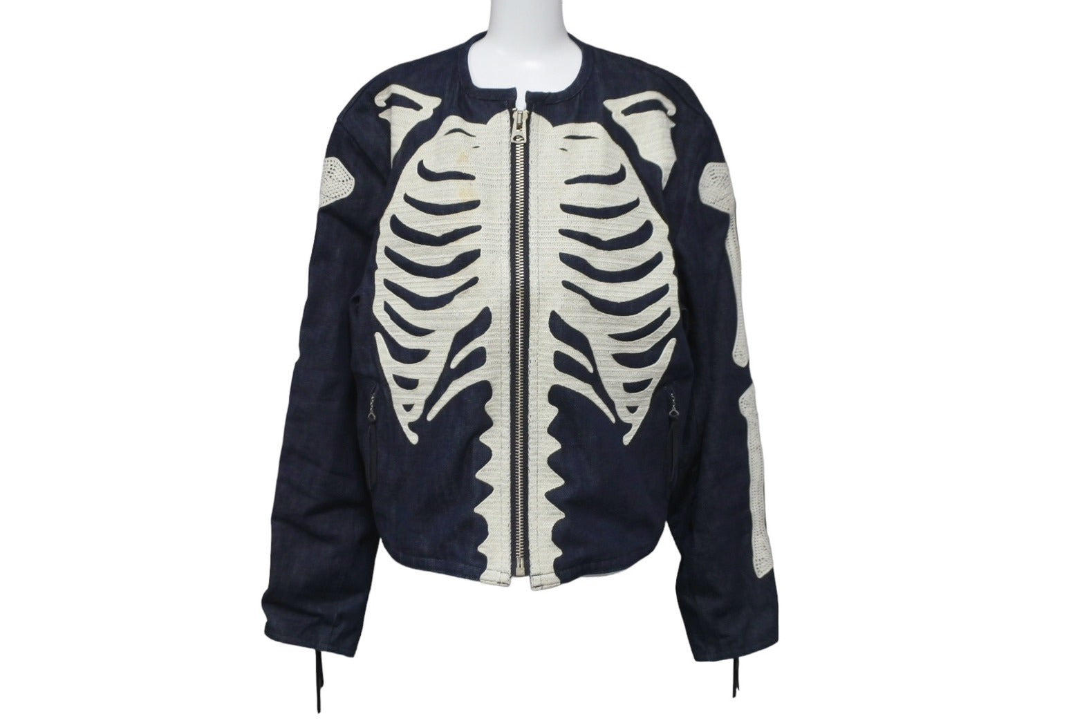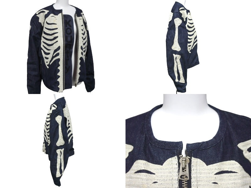 ボーン刺繍部分にシミ、毛羽立ち、ジップ金具部分に一部変色、裏地裾付近にわずかにシミがございます。その他目立つ傷や汚れはございません。